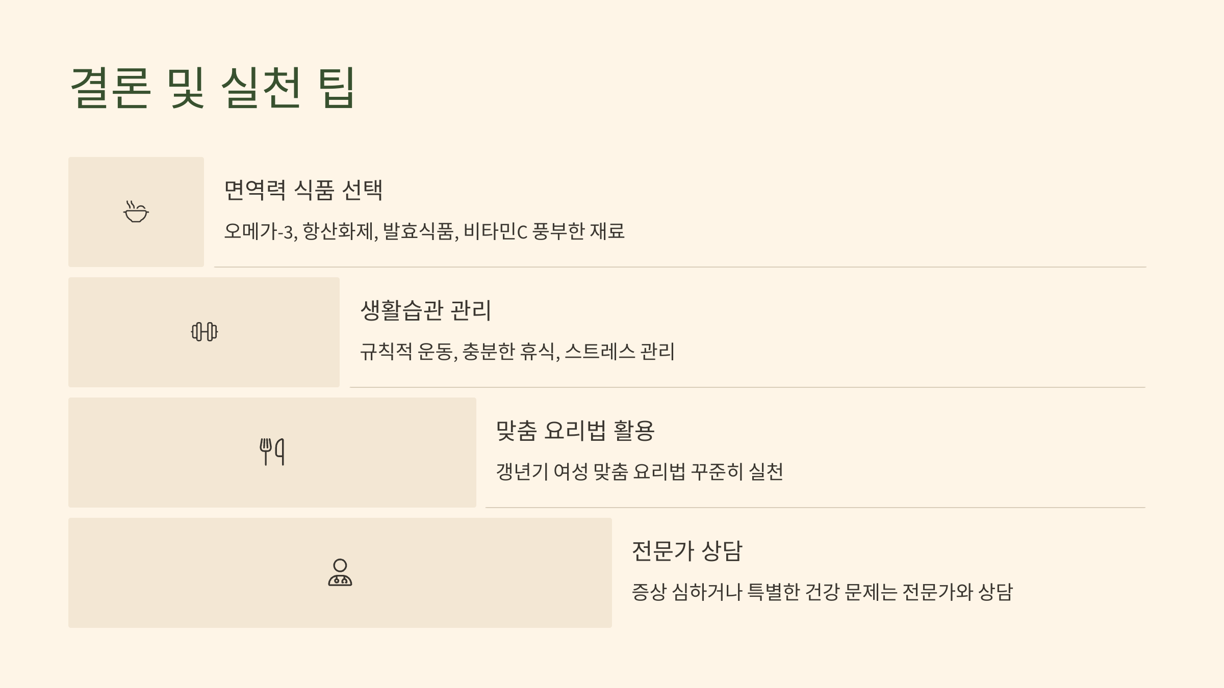 • 갱년기 여성은 면역력 약화에 주의해야 하며, 이를 위해 식단과 생활습관을 통합적으로 관리하는 것이 필수적입니다.