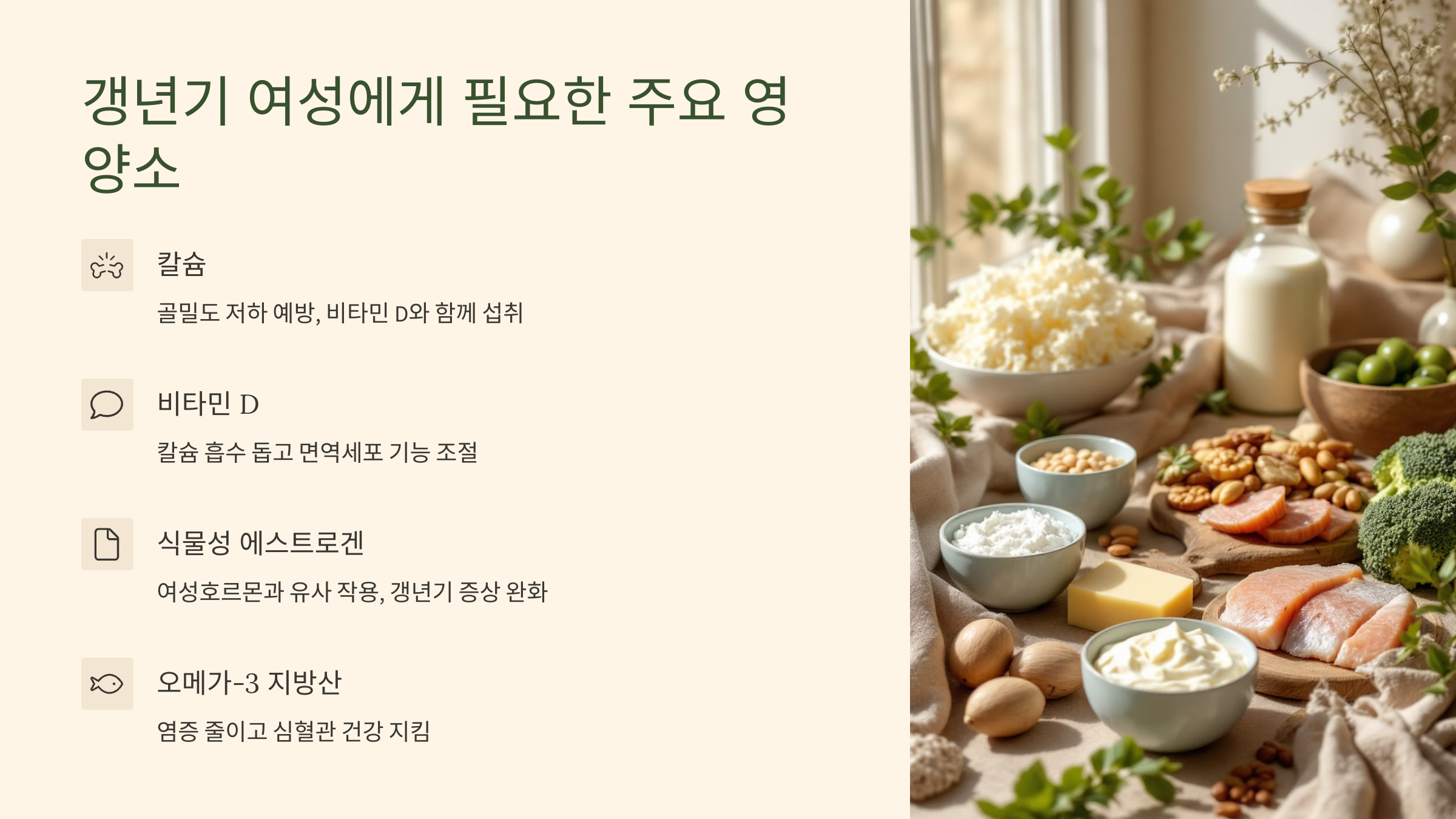 칼슘, 비타민 D, 식물성 에스트로겐, 오메가-3, 마그네슘, 비타민 B군은 매일 식단에서 놓치지 말아야 할 핵심입니다.