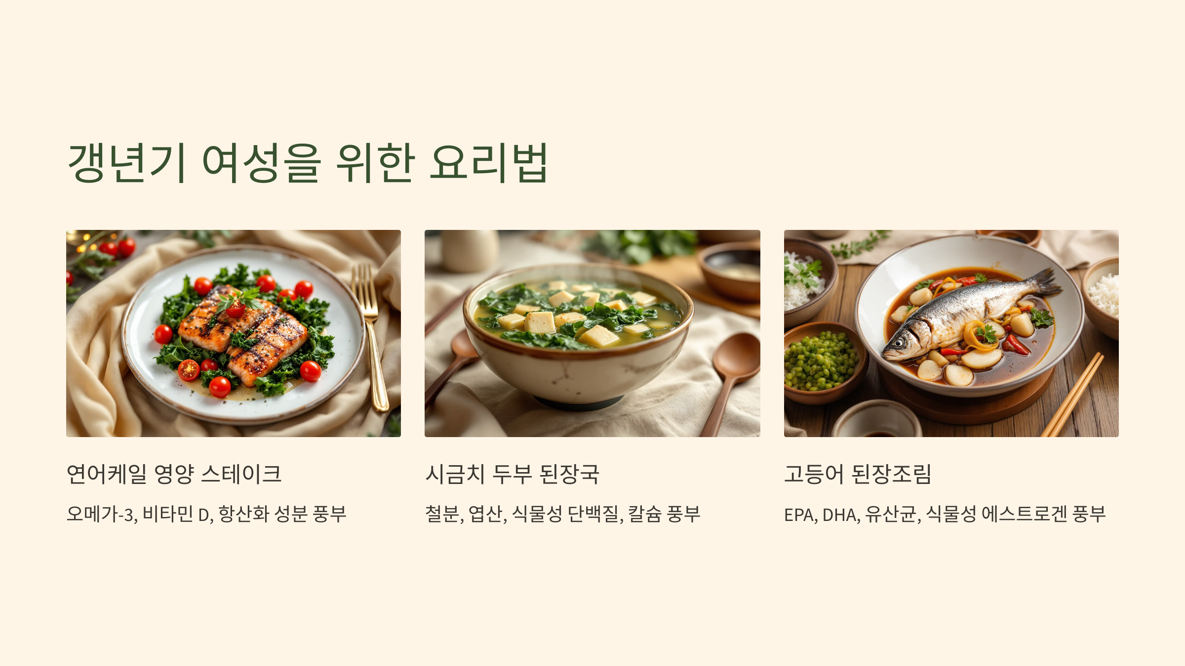 • 일상에서 쉽게 실천할 수 있도록 ‘갱년기 여성 맞춤 요리법’을 꾸준히 활용해 보세요.