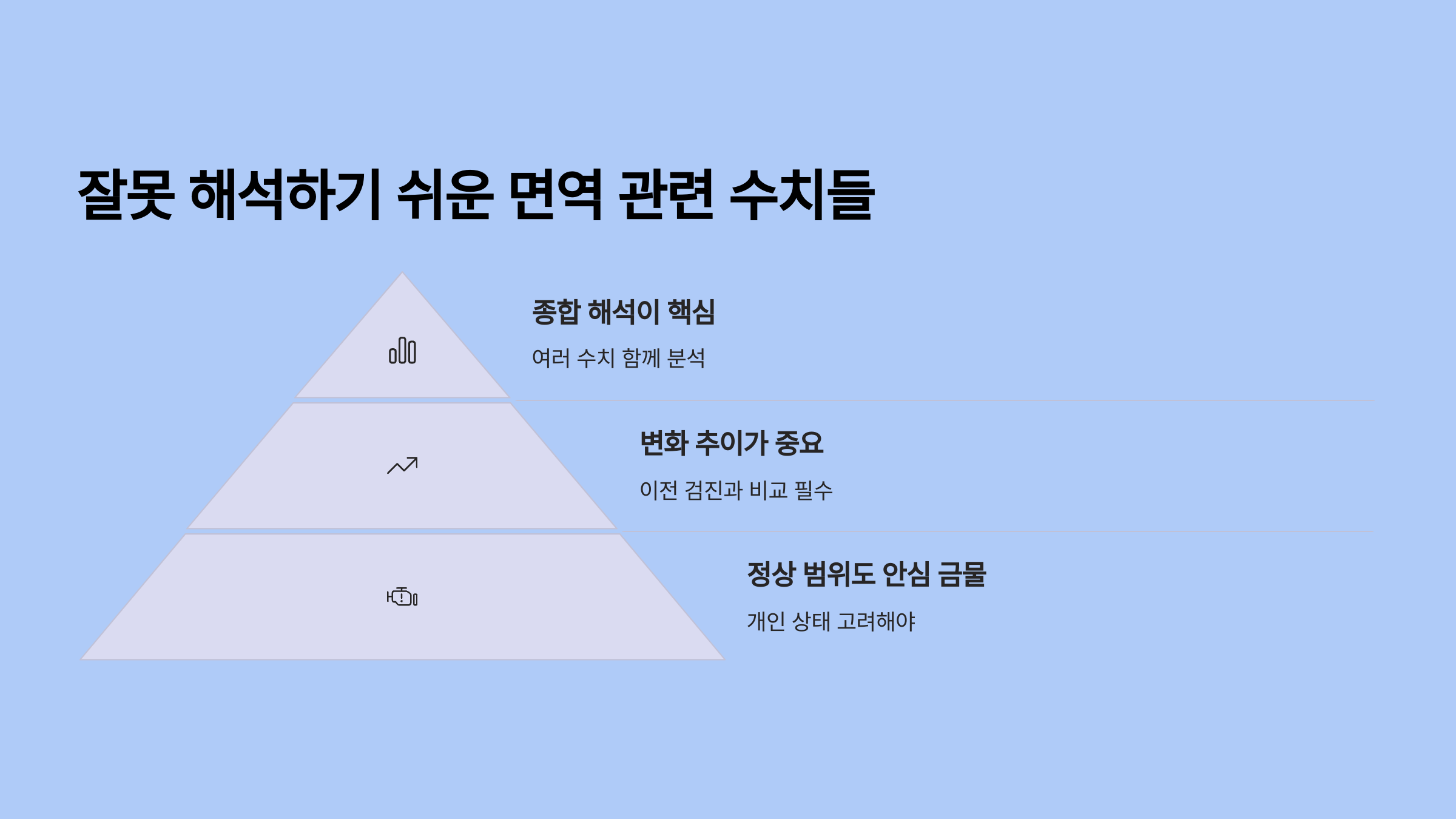 건강검진에서 제시하는 ‘참고 범위’는 수많은 인구를 대상으로 한 통계적 평균값입니다. 하지만 개인마다 면역 반응의 기준점은 다르기 때문에, ‘정상’ 범위라도 본인의 이전 상태보다 떨어졌다면 경계해야 합니다. - 정상 범위의 하한·상한 근처는 주의 깊게 해석해야 함