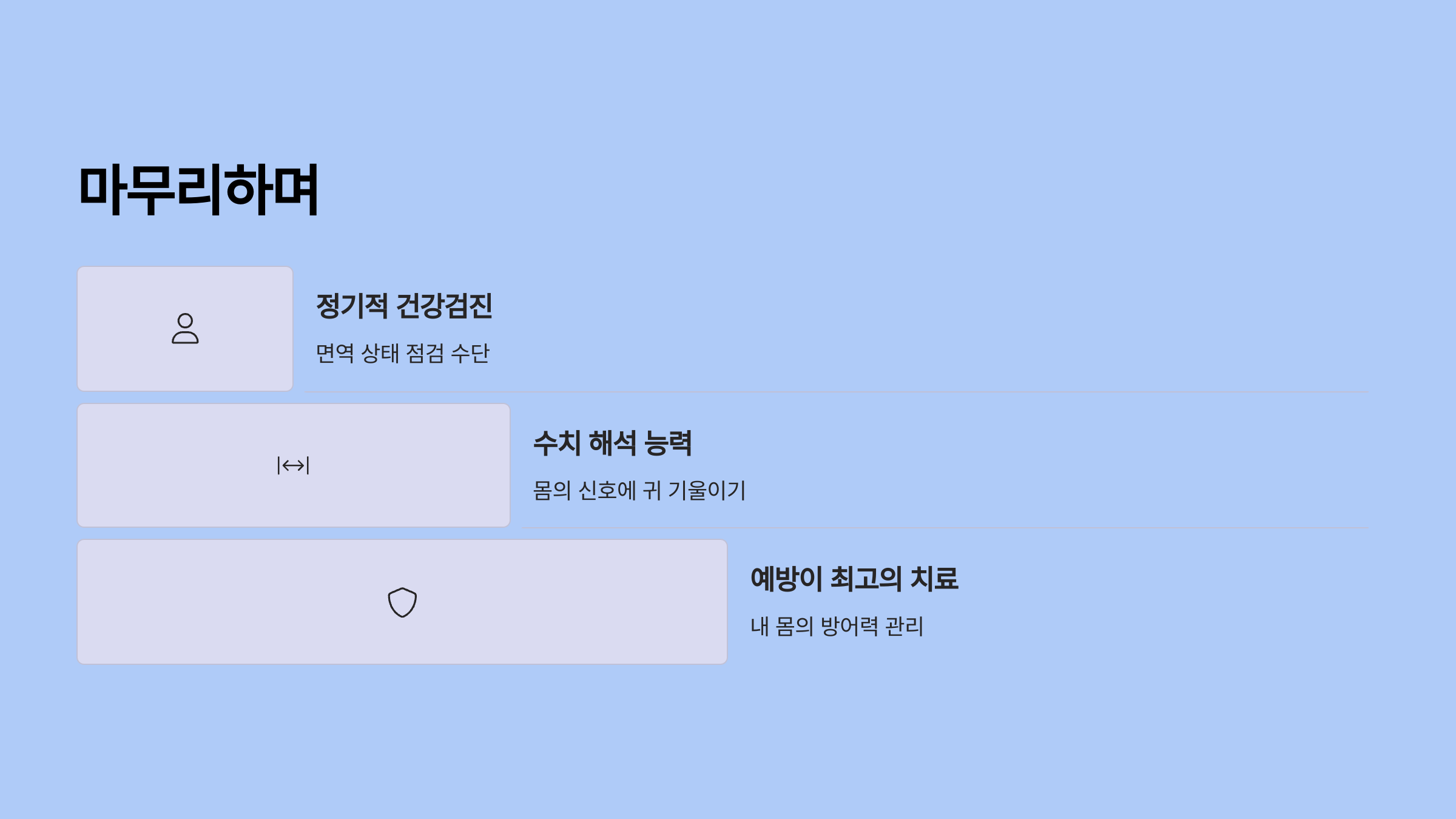 면역력은 한순간에 좋아지거나 나빠지지 않습니다. 정기적인 건강검진은 눈에 보이지 않는 면역 상태를 점검할 수 있는 중요한 수단입니다. 단순히 수치만 보는 것이 아닌, 그 수치들이 나타내는 몸의 신호에 귀 기울여야 합니다.