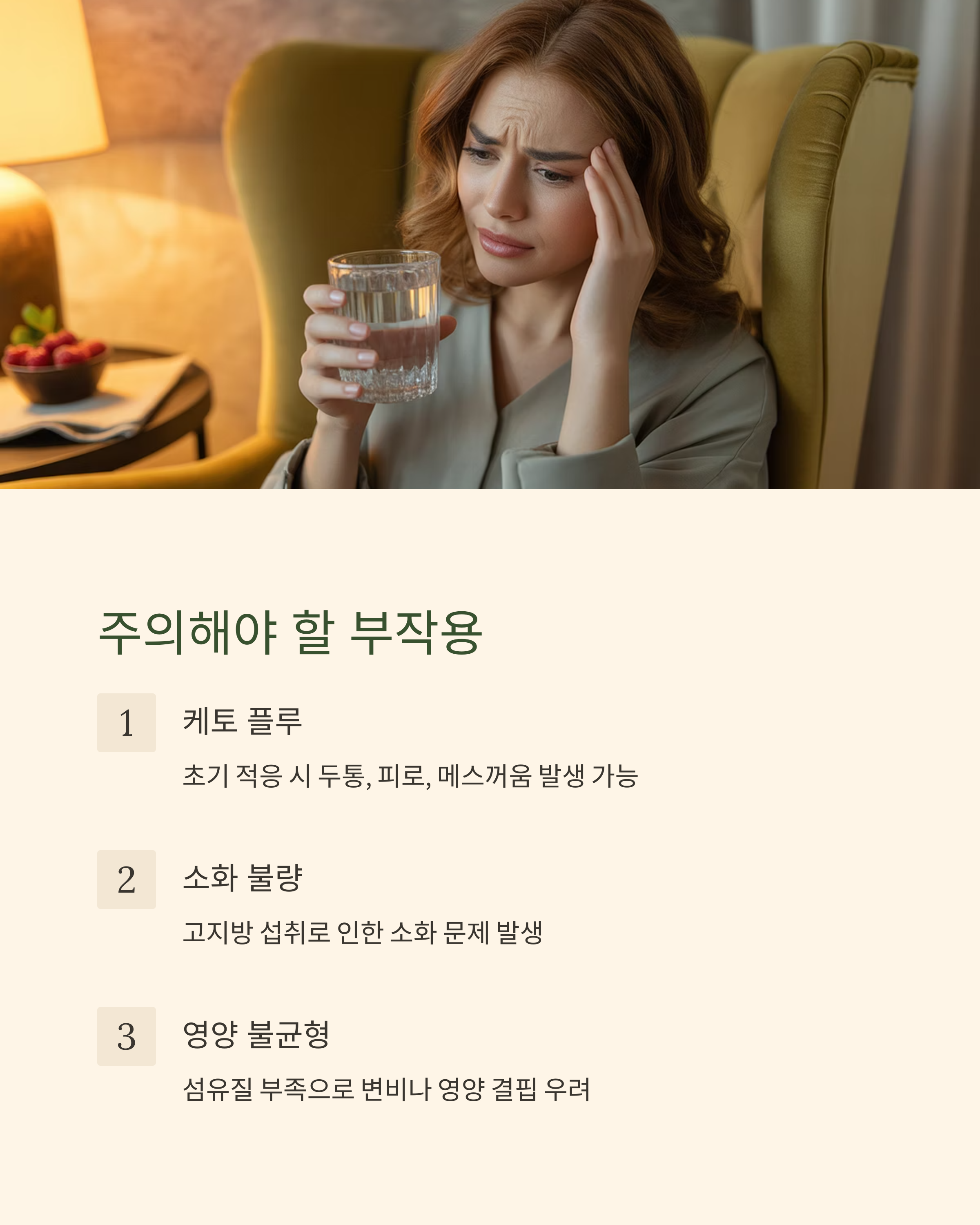 • 케토 플루 (Keto Flu): 다이어트를 시작한 초기 2~3일 동안 두통, 피로, 메스꺼움 등의 증상이 나타날 수 있습니다.