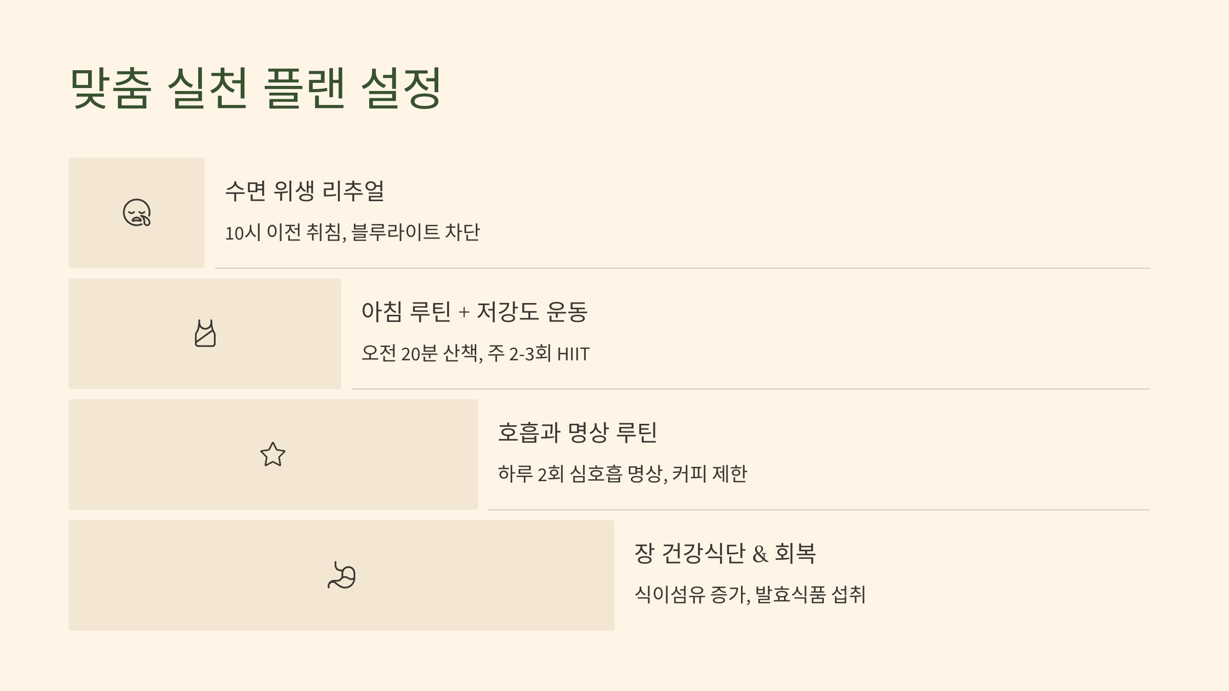 | 만성 피로 + 수면 부족 | 수면 위생 리추얼 | - 밤 10시 이전 취침 |