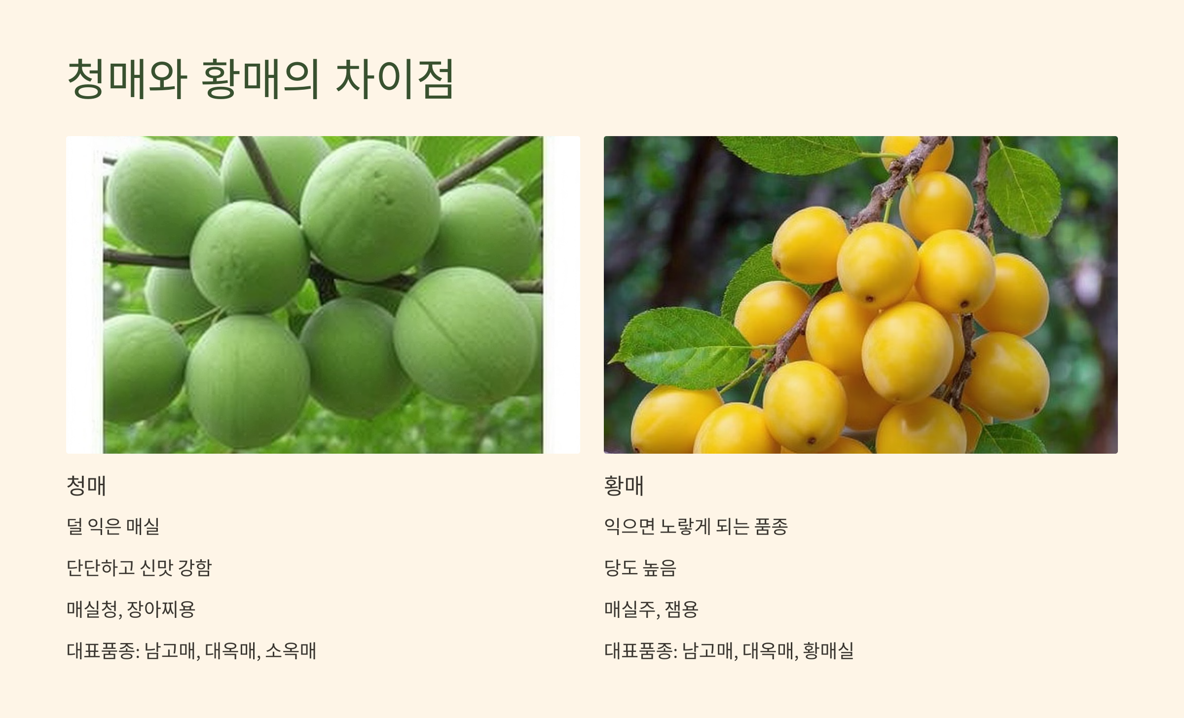 - 청매와 황매는 상태(성숙도)로 구분되기도 하지만,