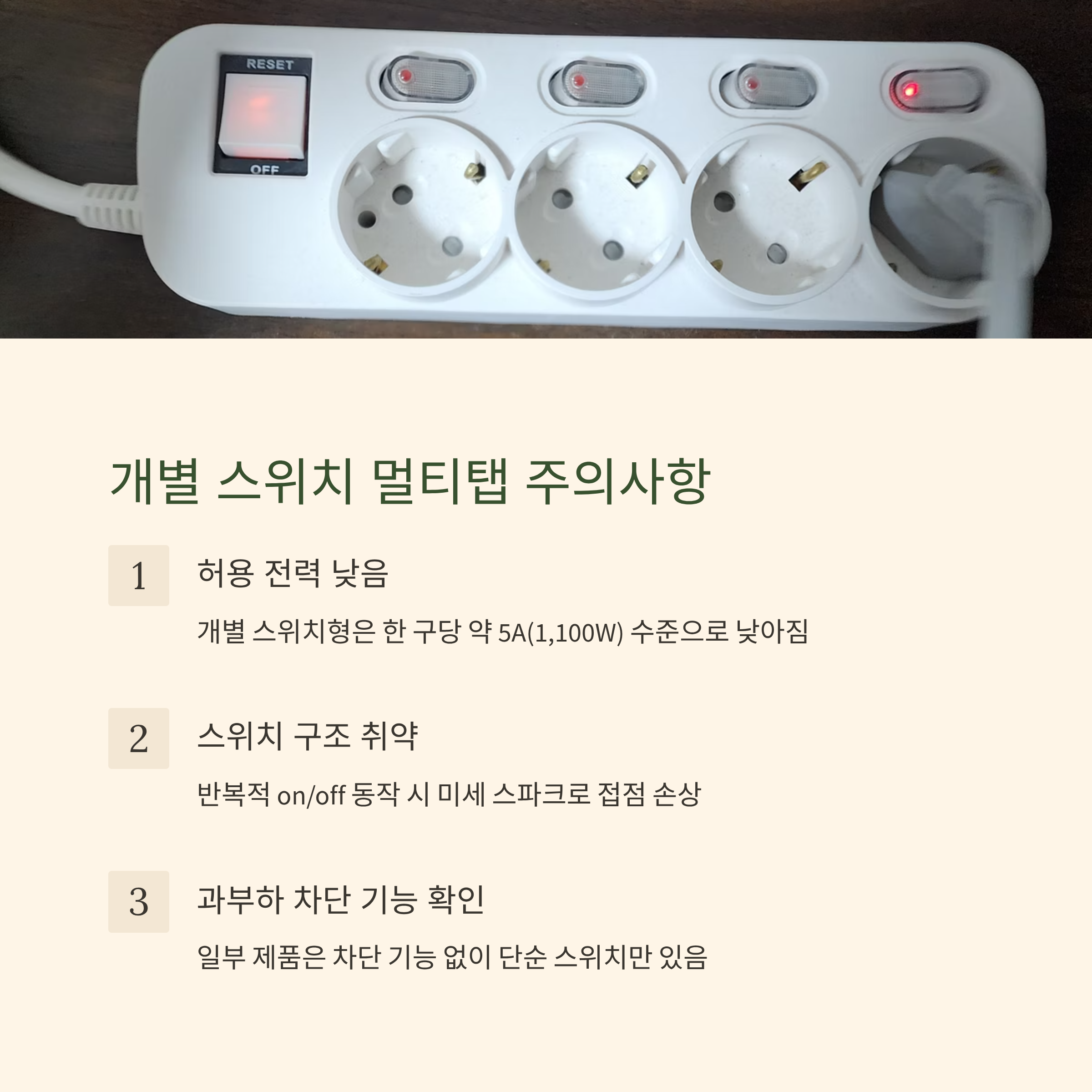 💡 특히 개별 스위치만 있는 제품은 접점이 약해 스파크 발생 위험이 높습니다.