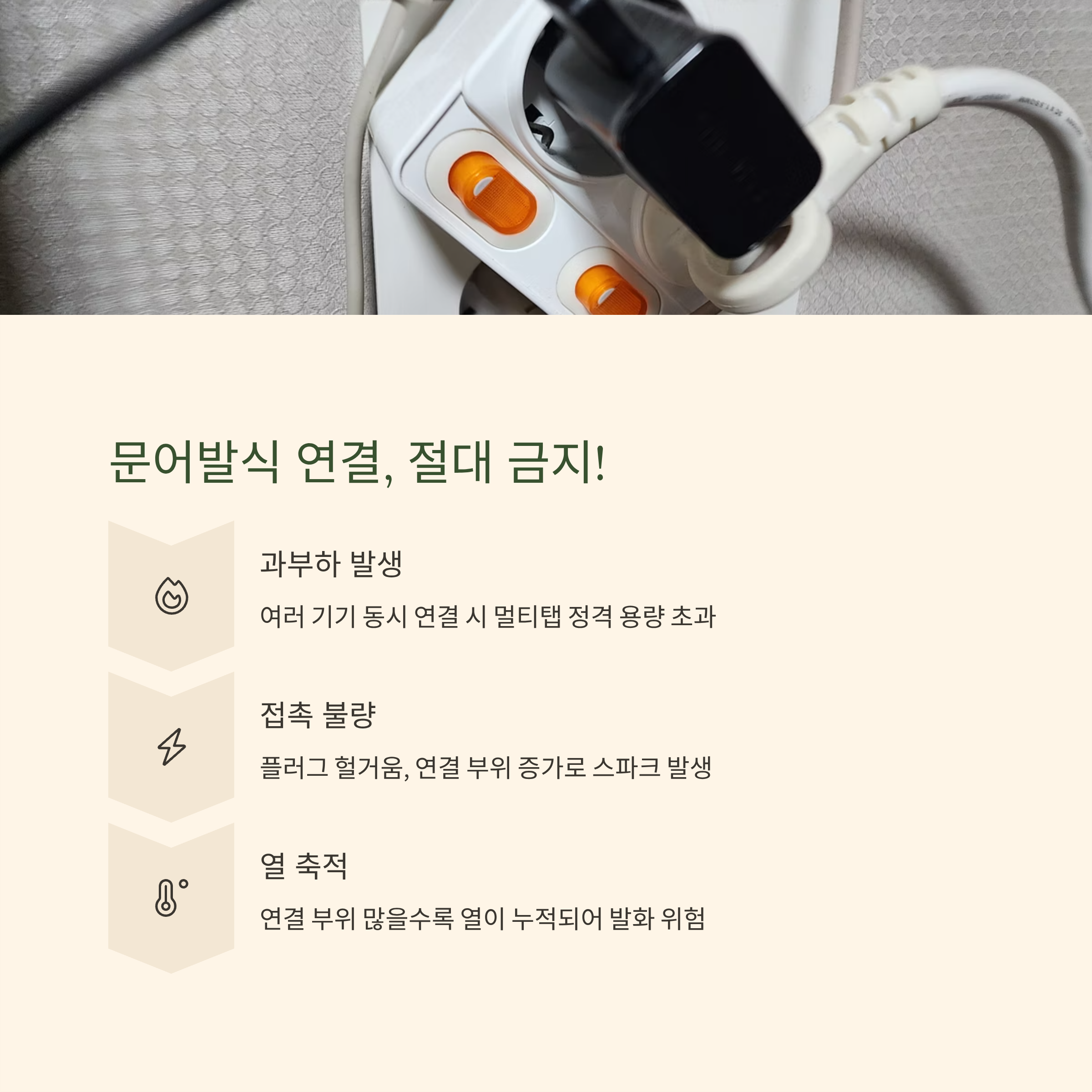 - 멀티탭에 또 다른 멀티탭을 연결하는 방식은 과부하와 화재 위험을 높입니다.