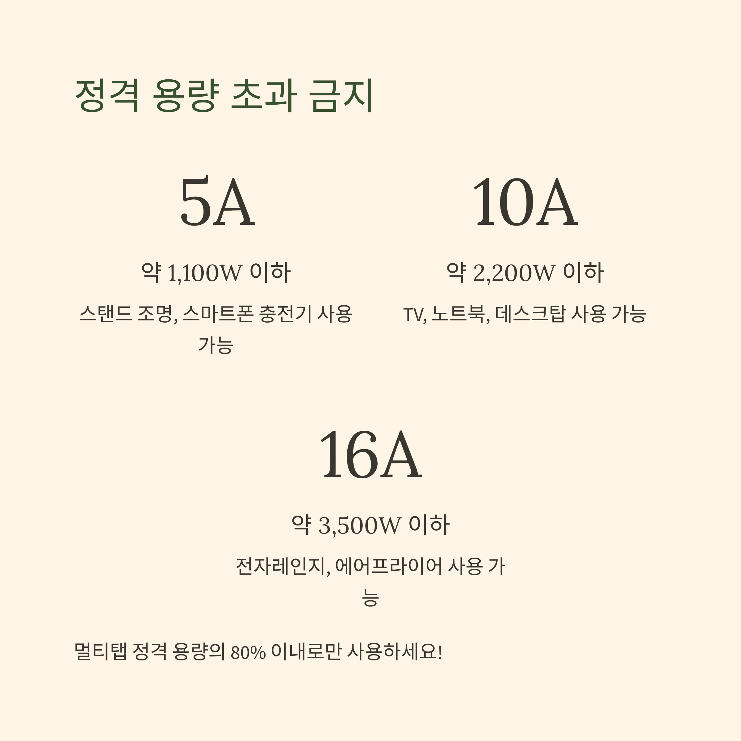 - 멀티탭 정격 용량 확인 후, 80% 이내로만 사용하세요.