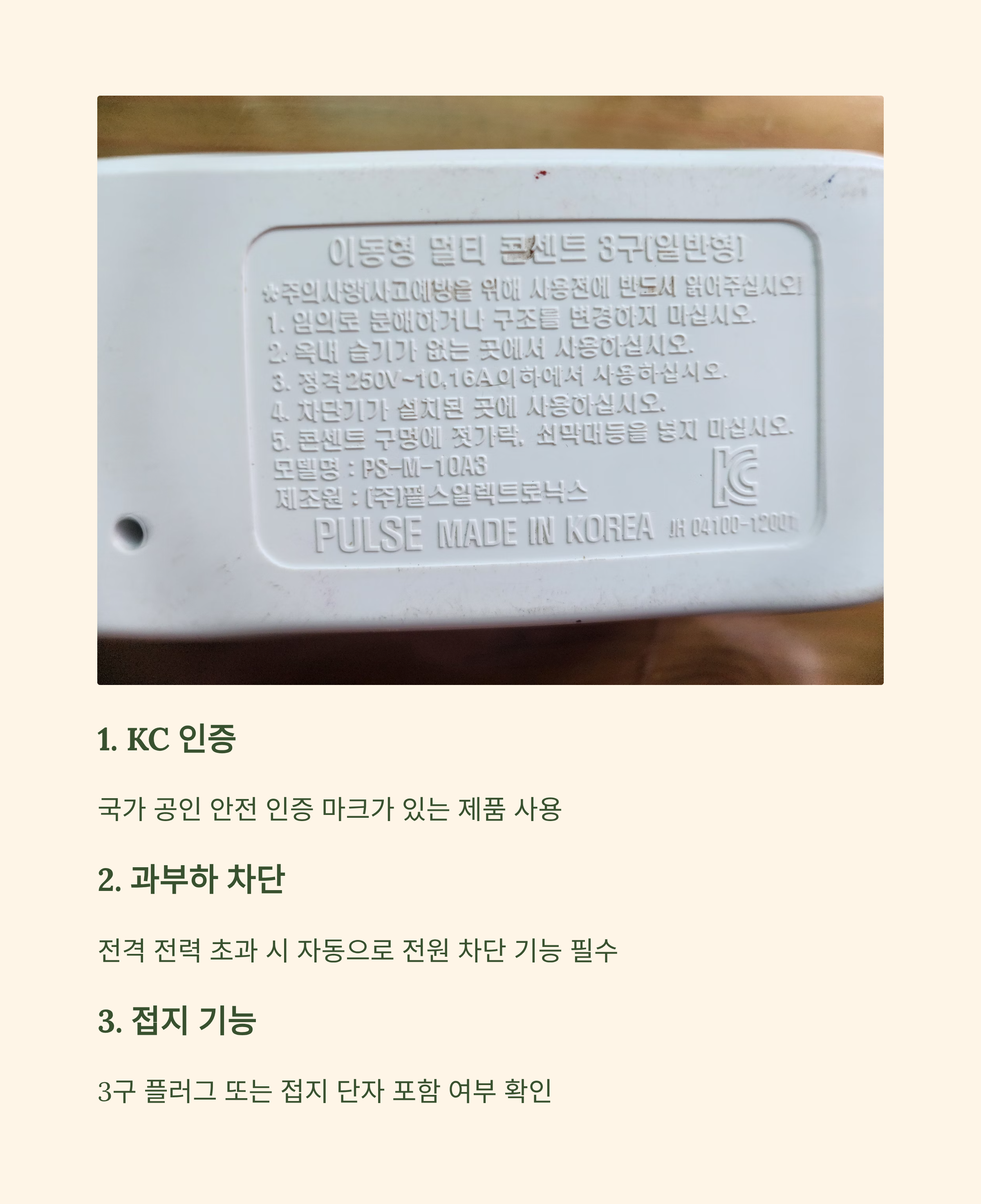 KC 인증, 과부하 차단, 접지 기능, 난연 소재 등 기본 조건을 갖춘 제품을 선택해야