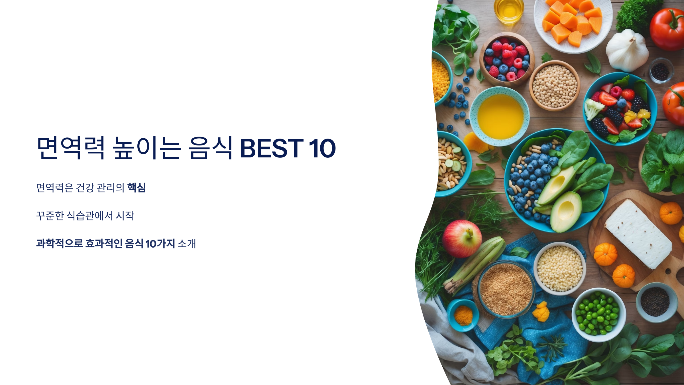 오늘은 일상 속에서 쉽게 접할 수 있고, 과학적으로 면역력 강화에 효과적인 음식 10가지를 소개합니다.