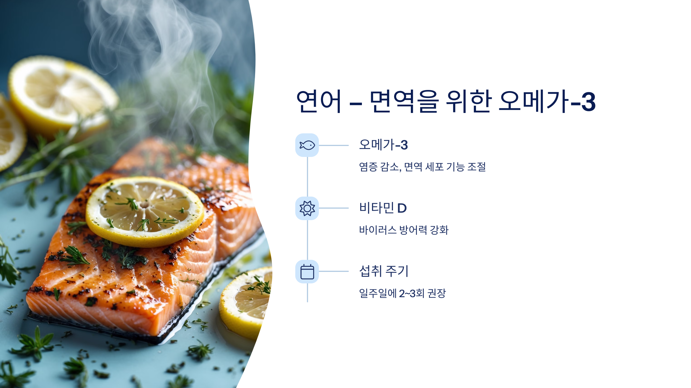 연어에 풍부한 오메가-3 지방산은 염증을 줄이고 면역 세포의 기능을 조절합니다.