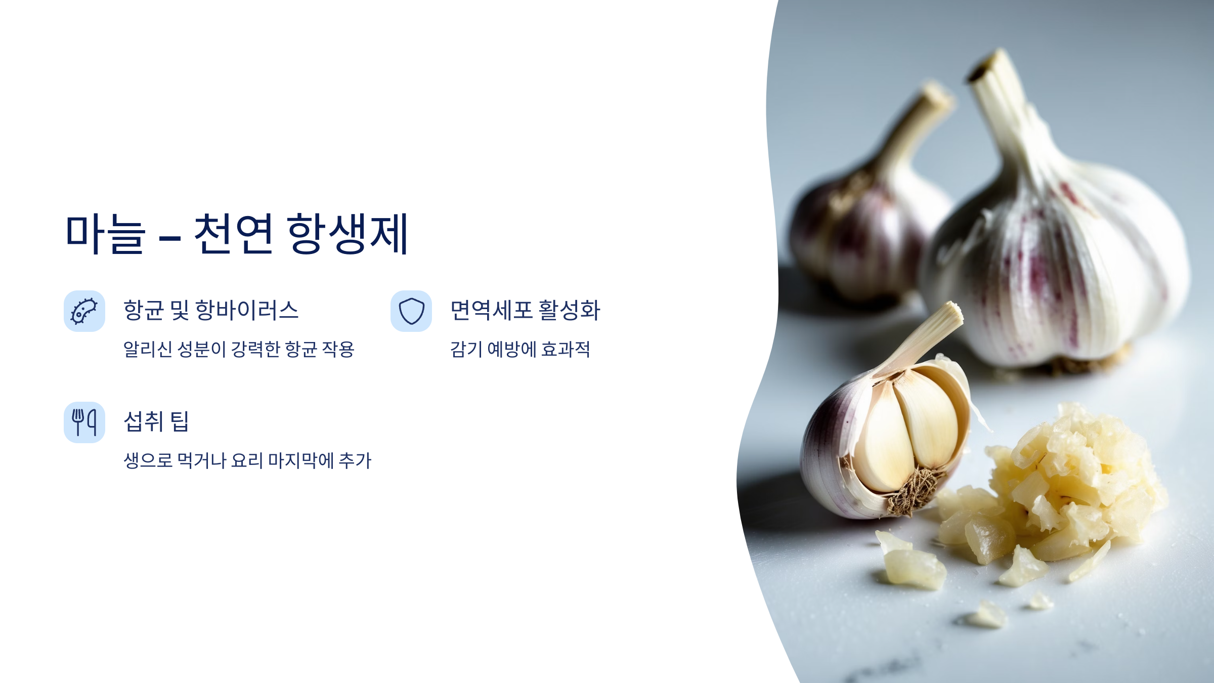 마늘의 알리신(allicin) 성분은 강력한 항균 및 항바이러스 작용을 합니다.