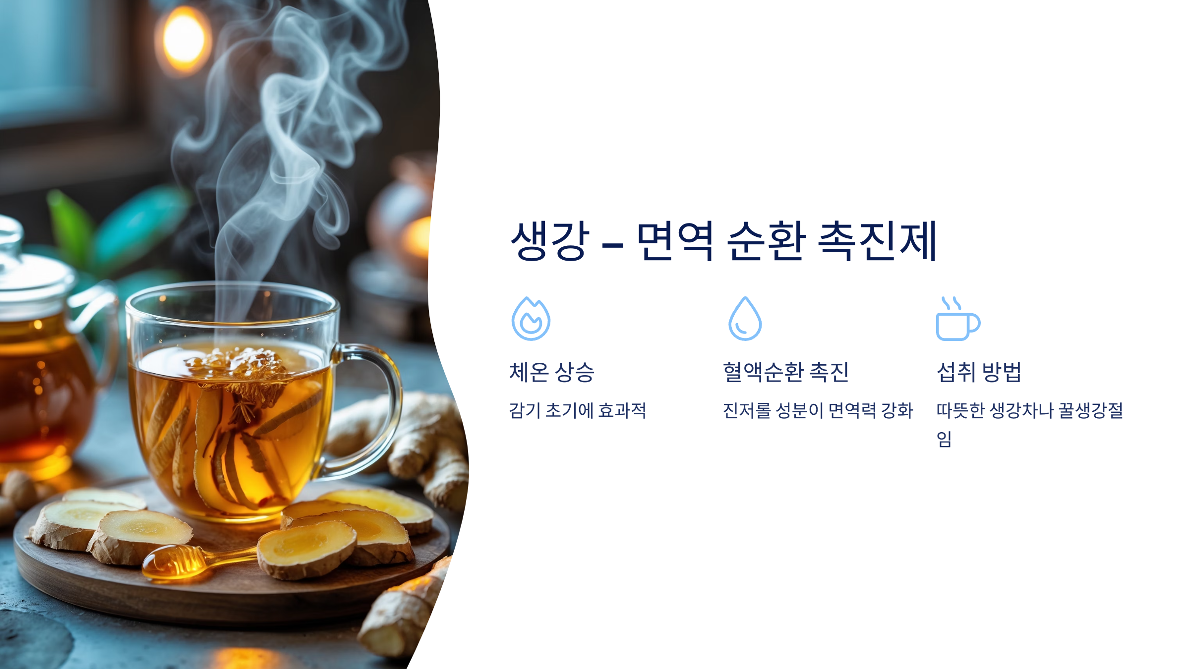 생강은 체온을 올리고 항염 효과가 뛰어나 감기 초기에 자주 권장됩니다.