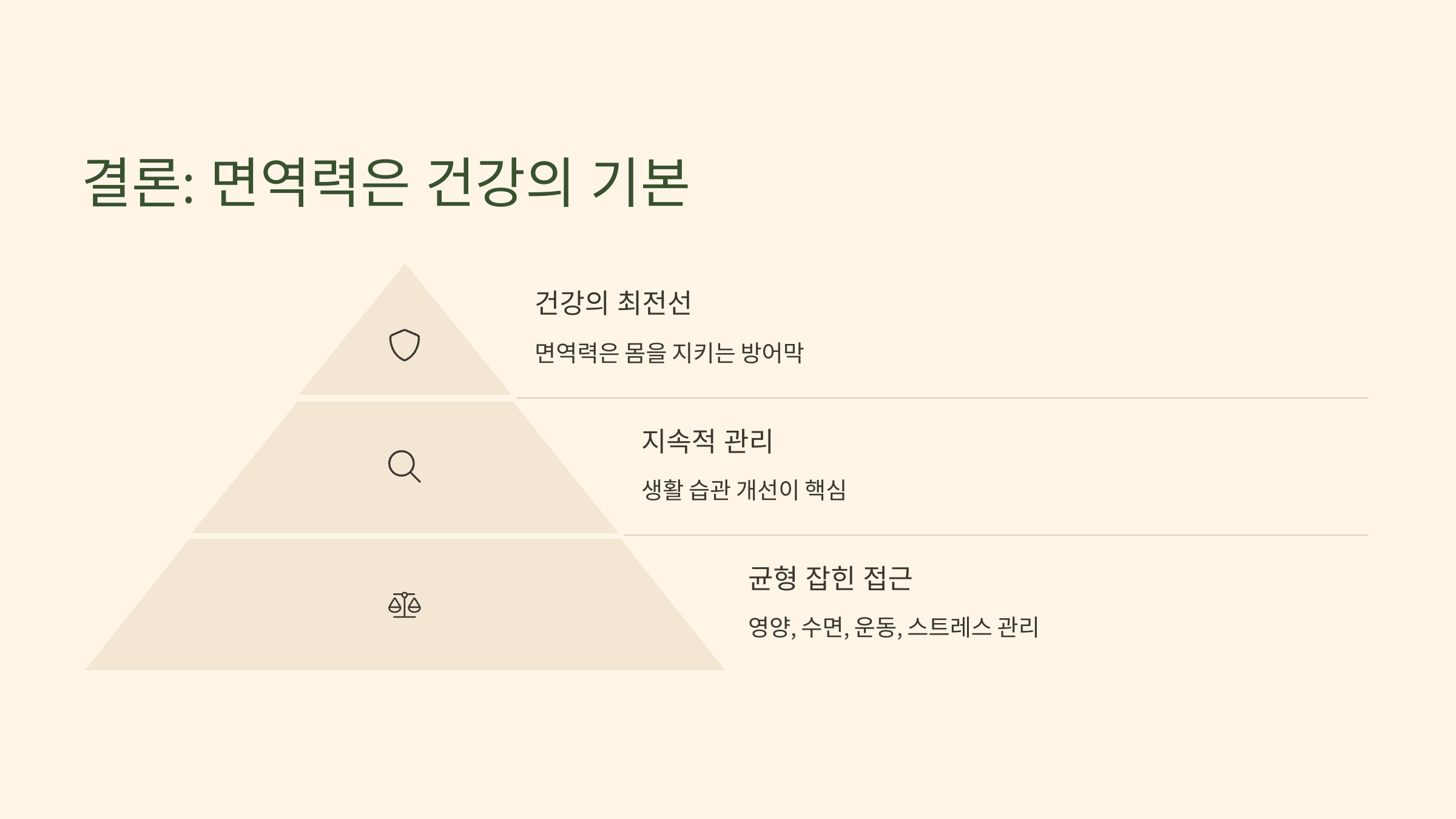 면역력은 단기간에 높이는 것이 아닌, 지속적이고 전반적인 건강 관리의 결과임을 기억하세요. 오늘부터 작은 습관 변화로 더 강하고 건강한 몸을 만들어가시길 응원합니다.