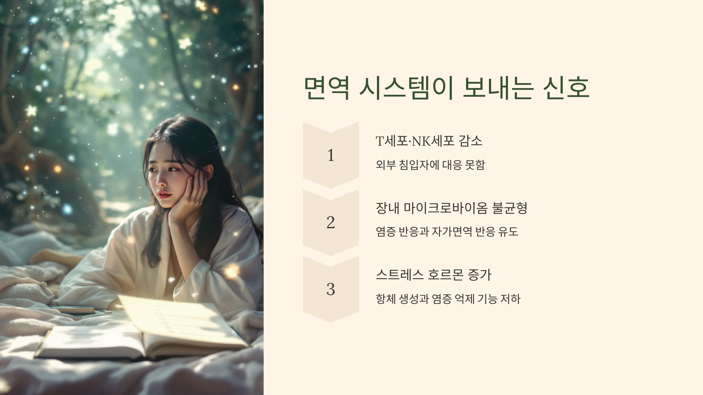 ▶ 바이러스, 세균을 직접 제거하는 **자연살해세포(NK세포)**와 T세포 수가 줄면 외부 침입자에 대응하지 못합니다. - 장내 마이크로바이옴 불균형