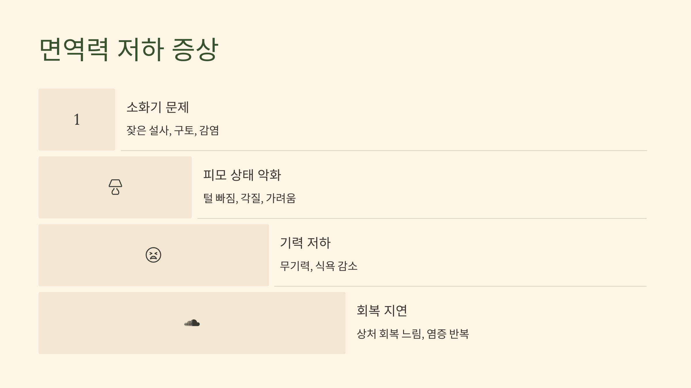 - 면역력 저하는 피부, 소화기, 행동, 회복력 등 전반적인 건강에 영향을 미칩니다.