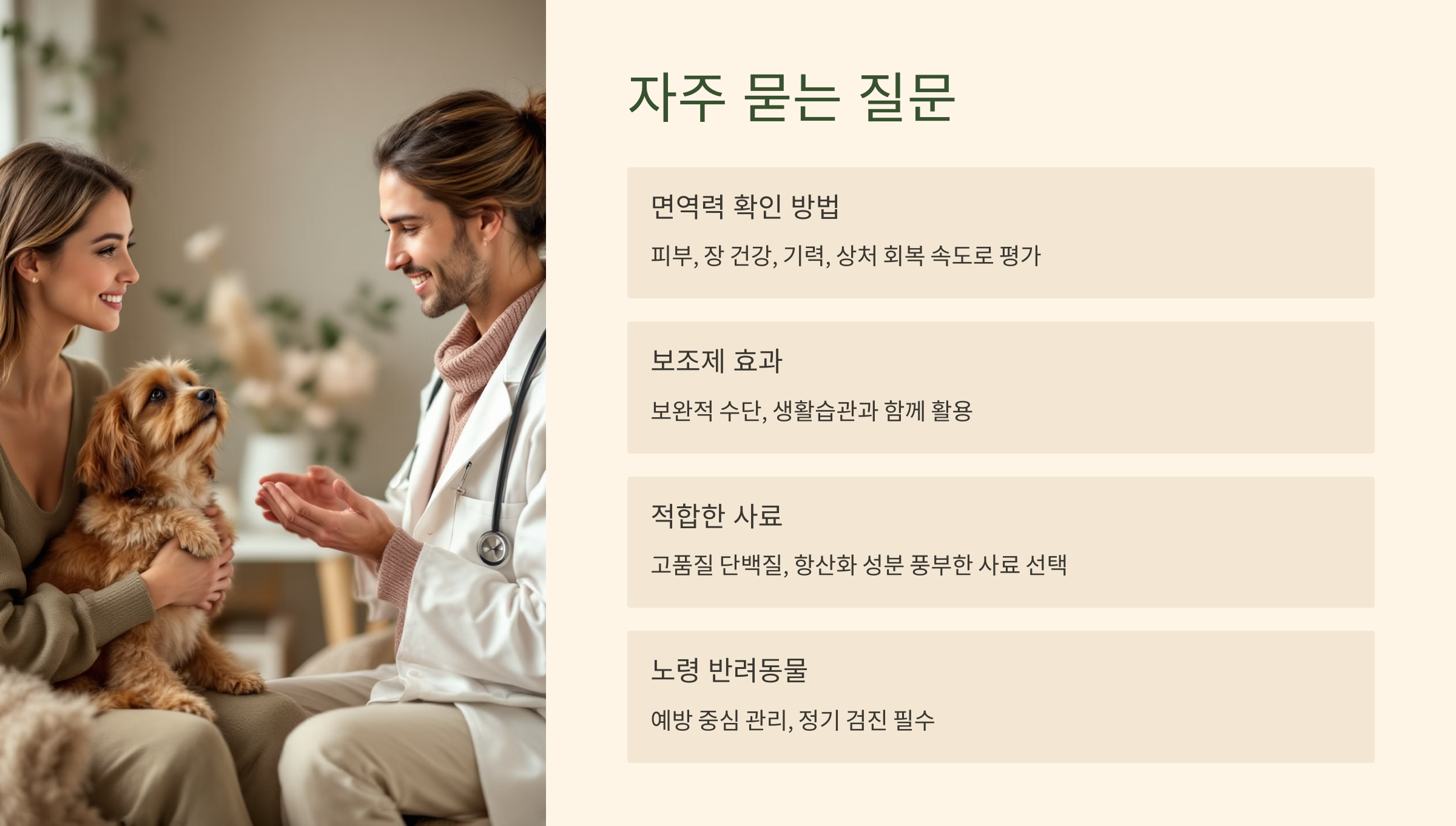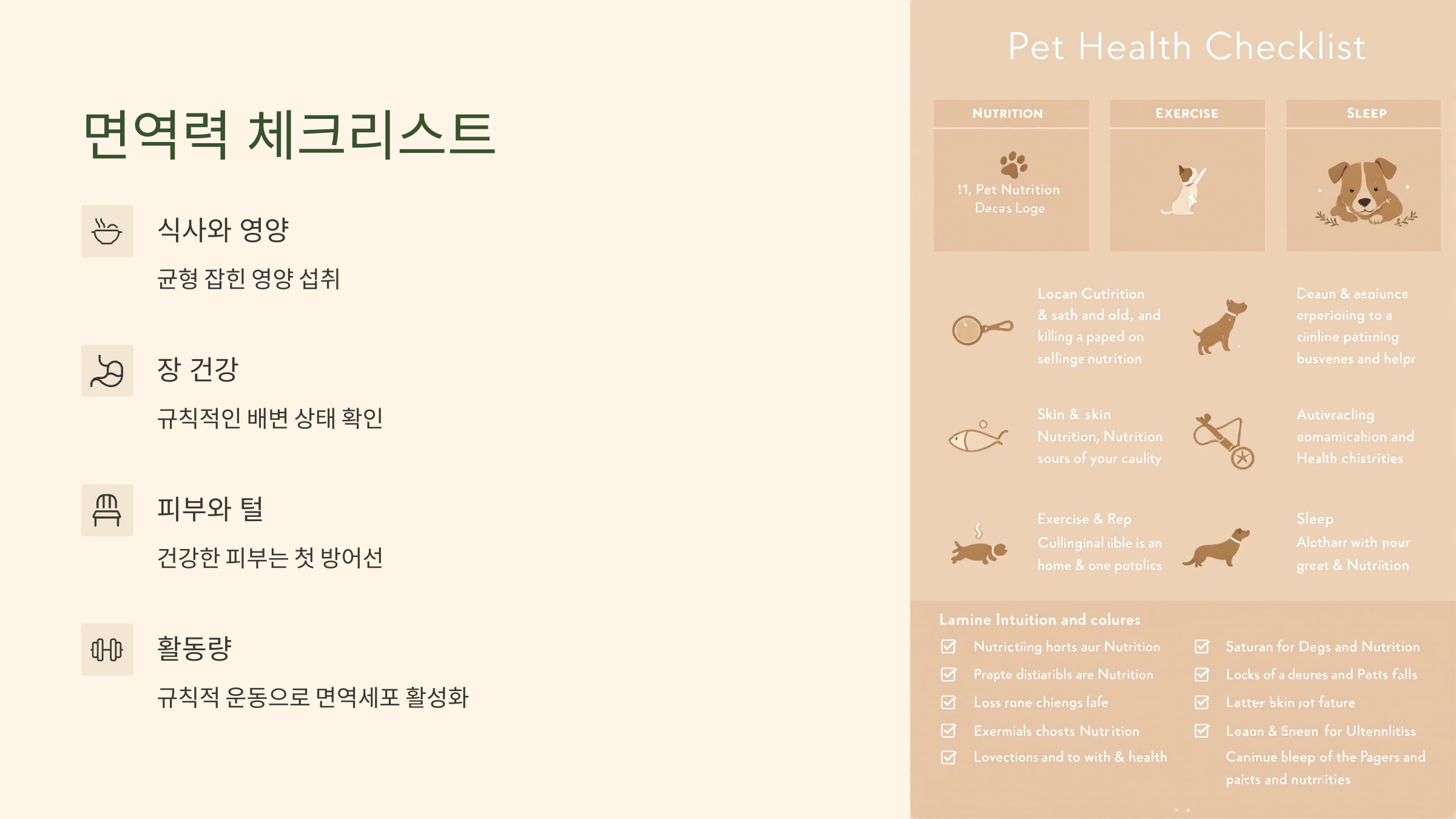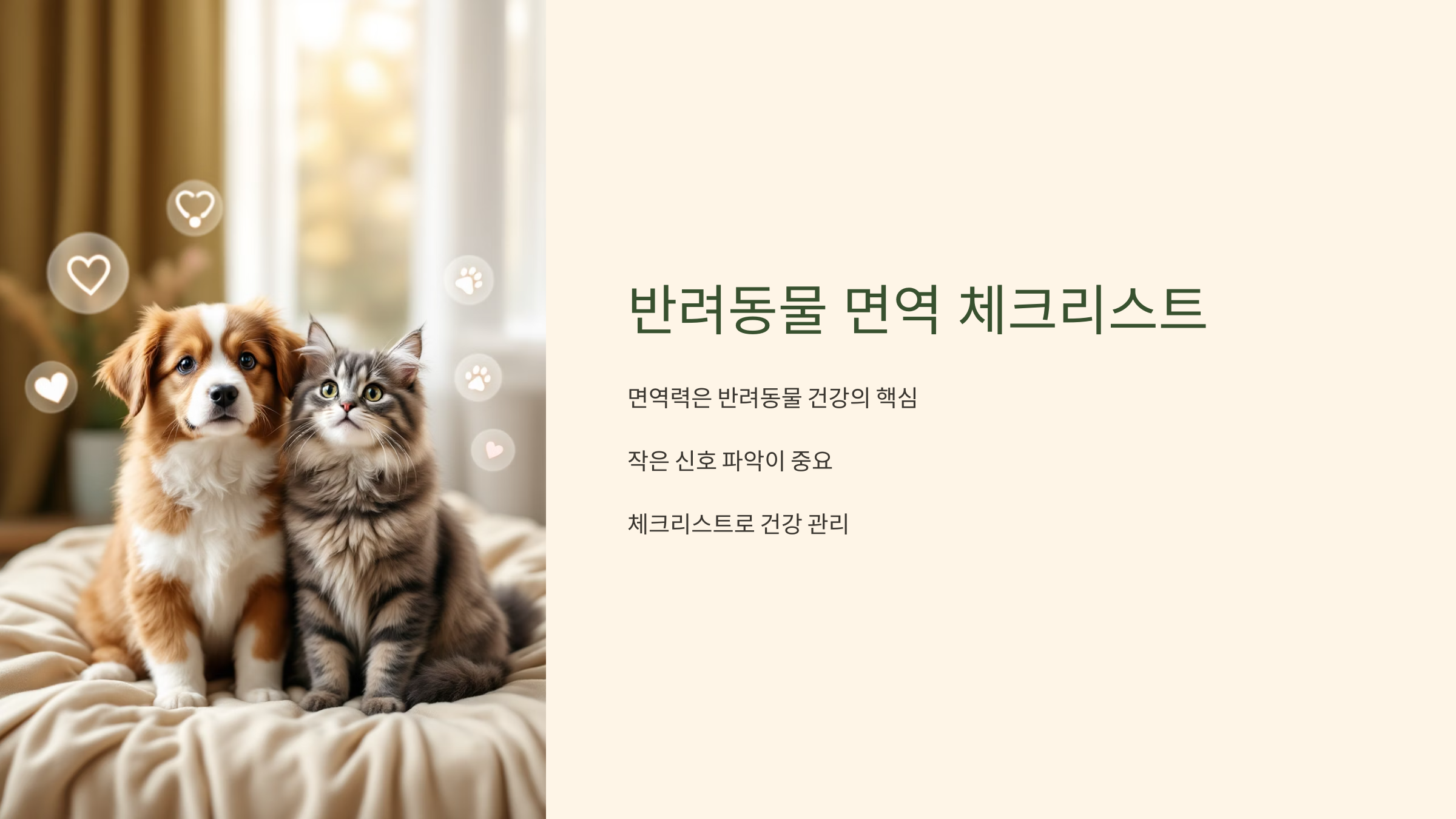 이 글에서는 반려동물의 면역 상태를 자가 점검할 수 있도록 구성된 체크리스트와 함께, 면역력 저하의 징후, 관리 팁, 자주 묻는 질문 등을 통해 건강한 일상을 유지할 수 있는 방법을 안내합니다.