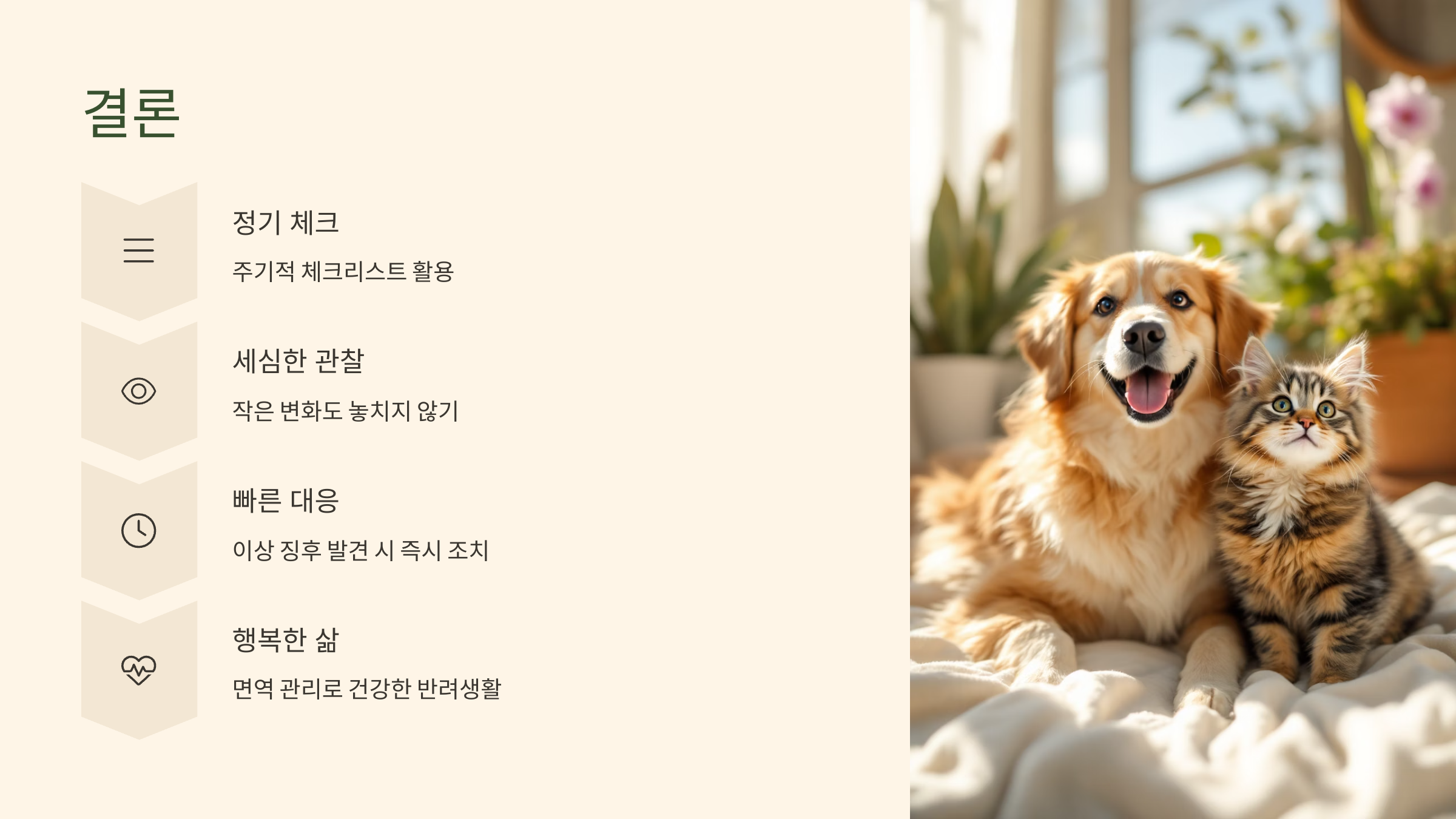 반려동물의 건강은 보호자의 작은 관심에서 시작됩니다. 꾸준한 체크와 세심한 관찰을 통해 면역력을 유지하고 질병을 예방할 수 있습니다. 체크리스트를 주기적으로 활용하고, 이상 징후가 보이면 빠르게 대응해 주세요. 면역력 관리는 단순한 예방을 넘어, 반려동물과의 행복한 삶을 위한 기본 조건입니다.