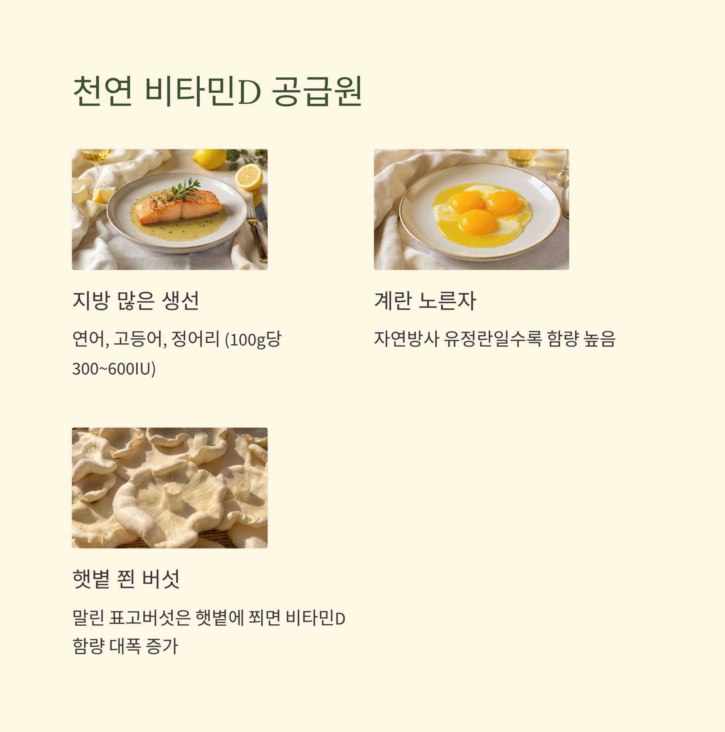 - 햇빛 부족 → 식품 + 보충제 병행 필수