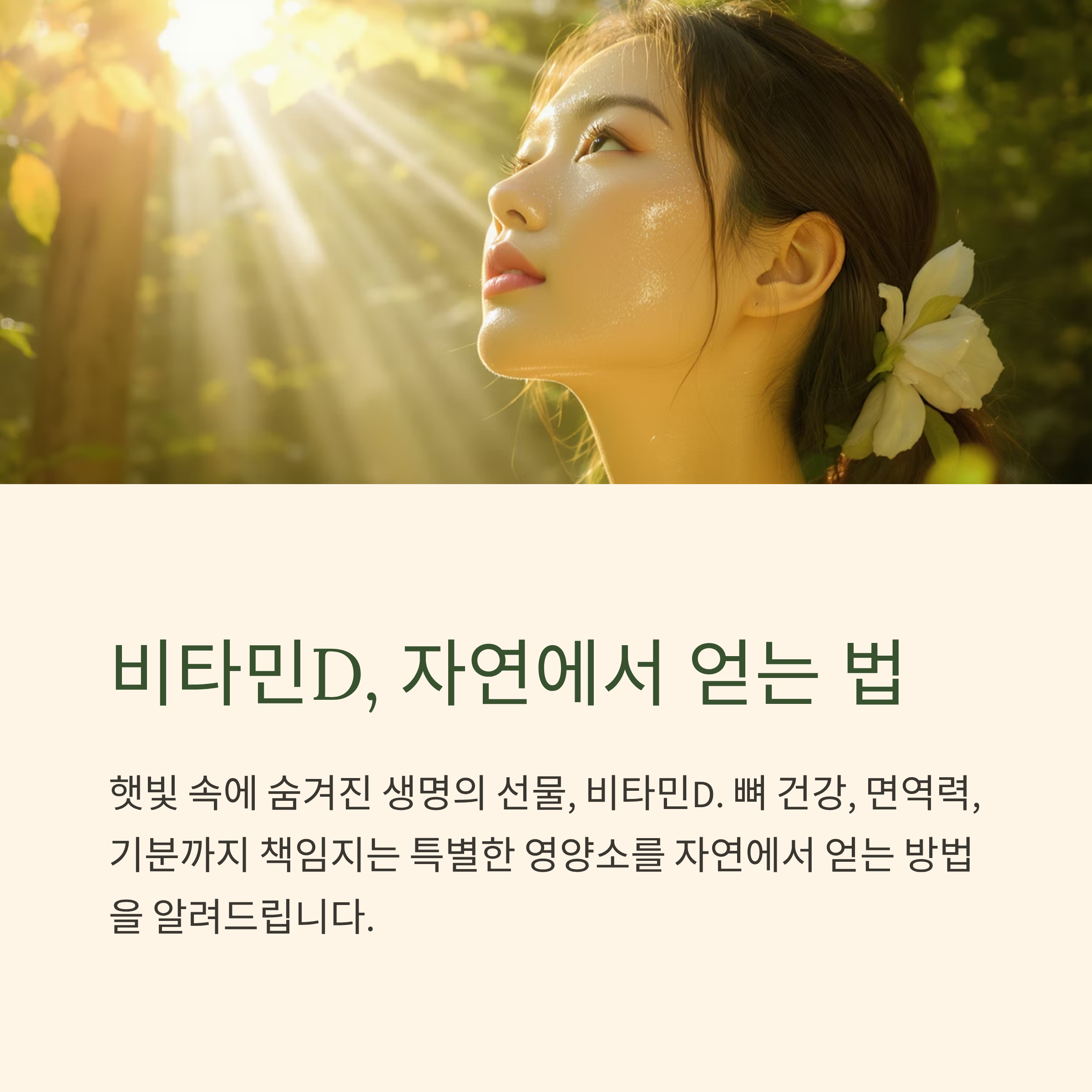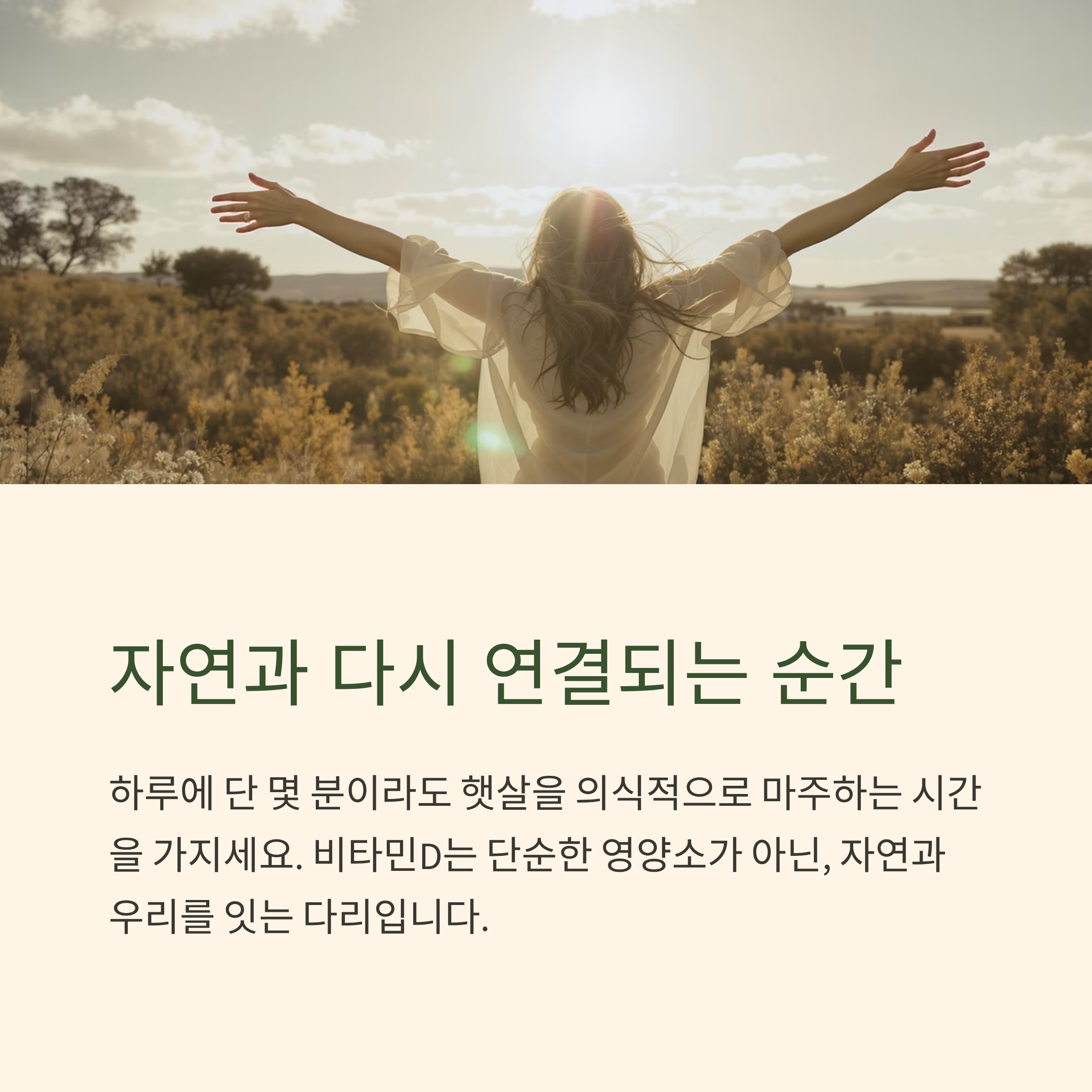 자연은 가장 훌륭한 치유자이자 스승입니다. 햇살 아래 걷고, 자연이 준 음식을 맛보며, 자연의 리듬에 몸과 마음을 맞출 때, 우리는 비로소 비타민 D를 온전히 받아들일 수 있습니다.