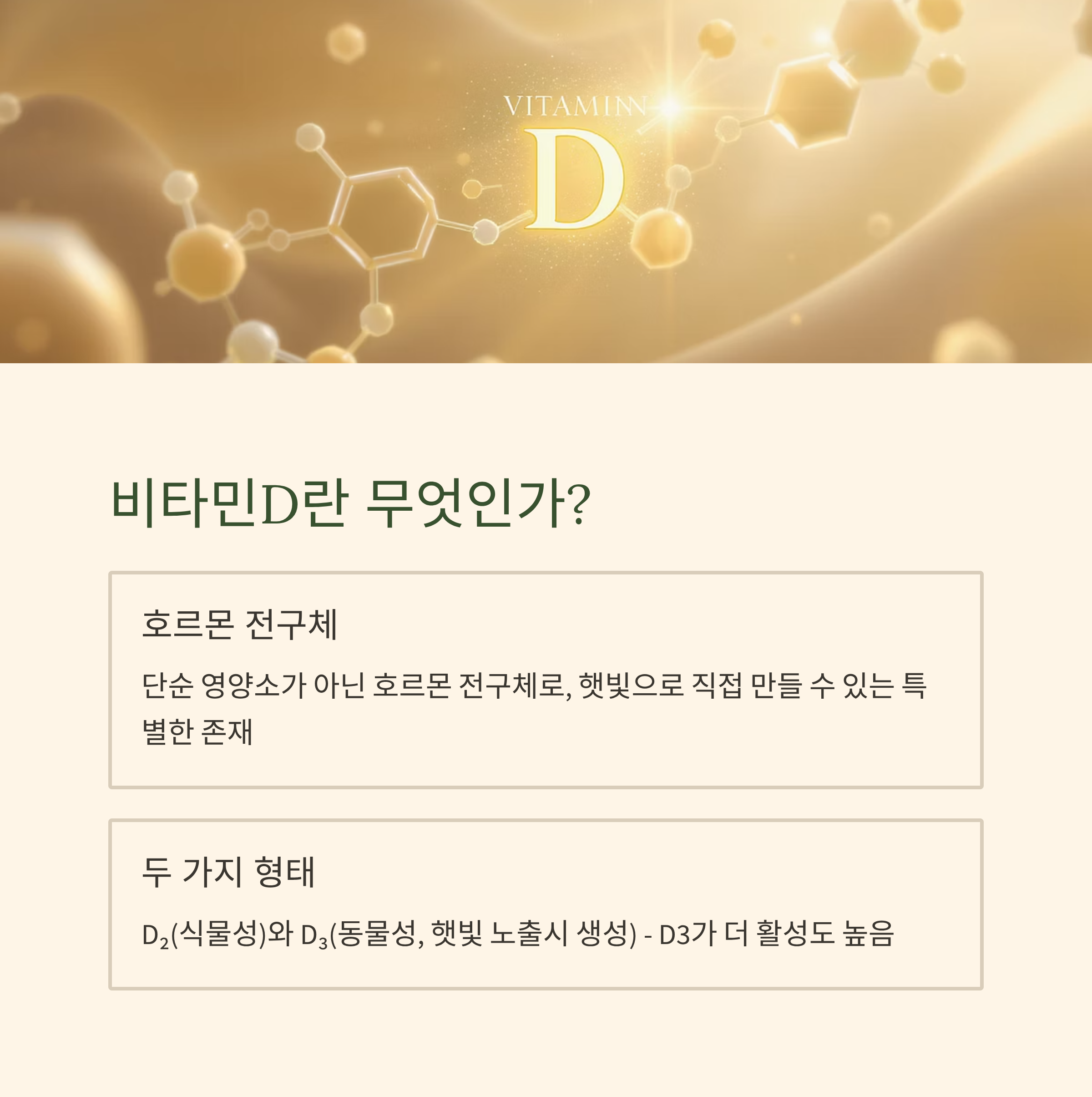 햇빛만으로도 몸에서 합성되는 이 특별한 영양소는, 뼈를 단단하게 하고, 면역을 조절하며, 기분까지 밝혀줍니다.