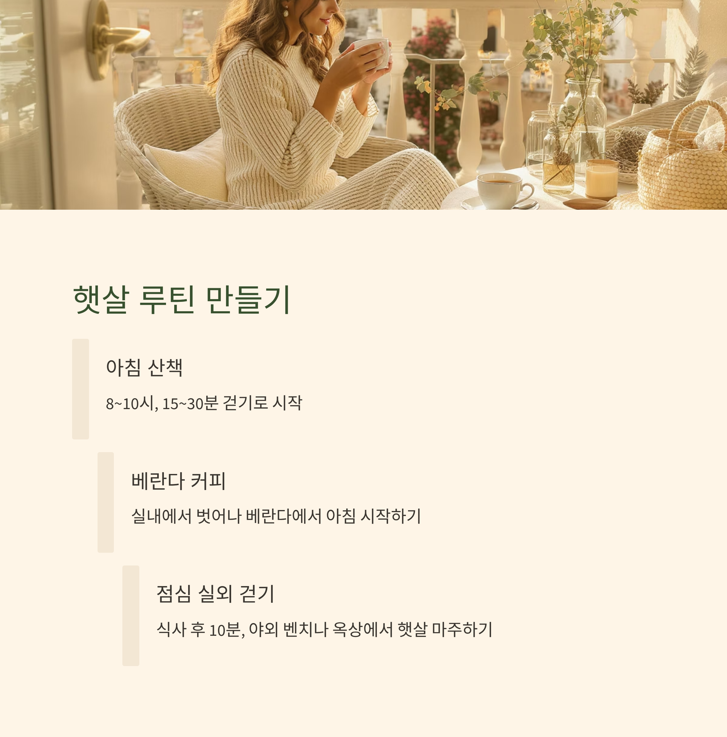하루 단 몇 분이라도 햇살을 의식적으로 마주하는 시간을 가지세요.