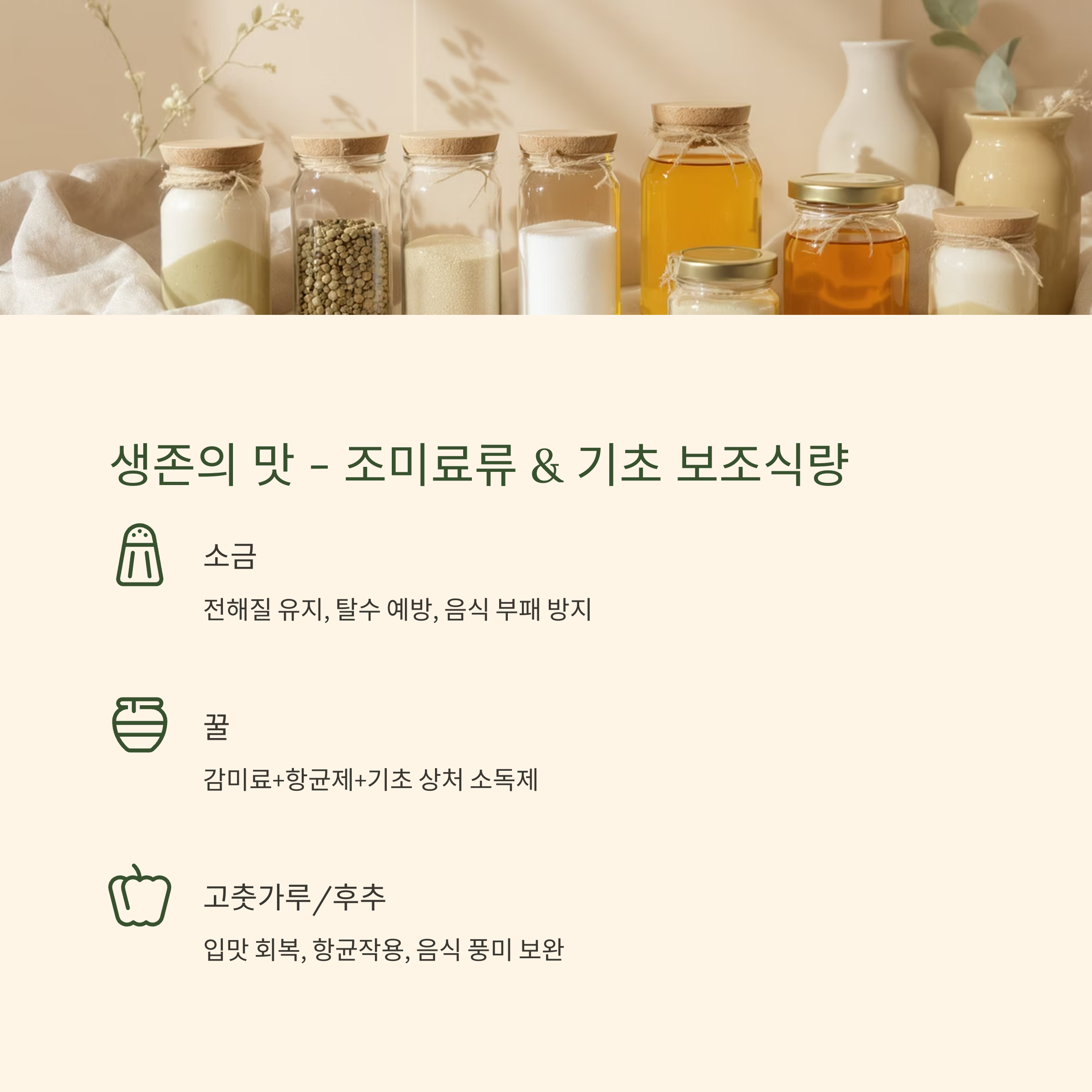 비상상황에서 음식의 맛은 사치가 아닙니다. 조미료는 미각의 안정뿐 아니라 생리적 균형, 칼로리 보충, 위생 보조 수단으로 활용됩니다. 소금, 설탕, 꿀, 간장, 고춧가루, 식초 등은 모두 ‘작지만 다기능’의 생존 도구입니다.