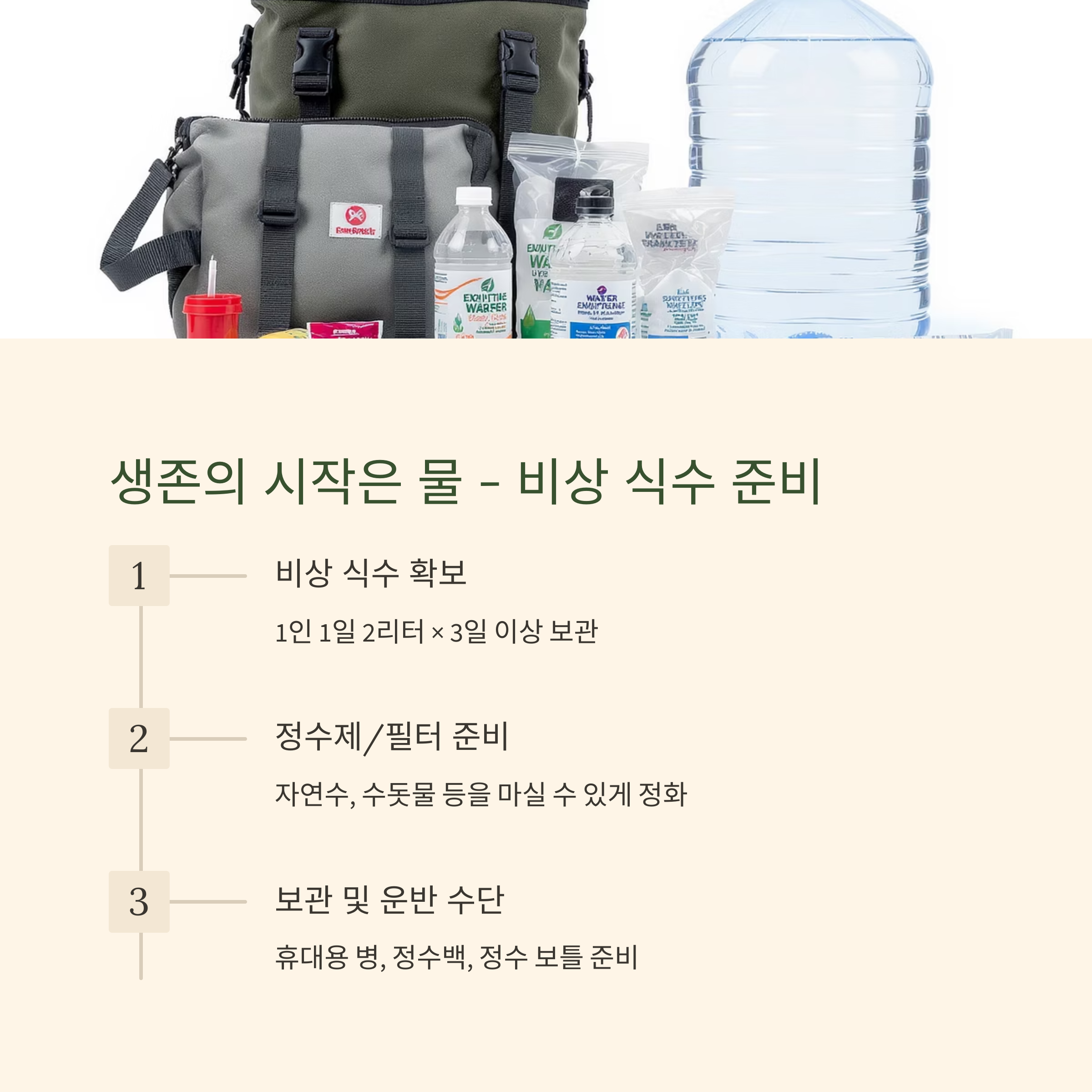 비상용 포장 생수를 기본으로 하되, 정수제와 필터를 준비하여 오염수도 안전하게 바꿀 수 있도록 대비해야 합니다. 물은 생명의 근원이며, 그 확보는 곧 생존의 첫 관문입니다.