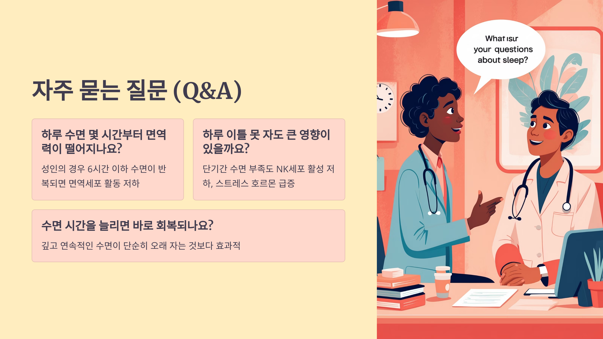 수면이 부족하면 NK세포의 작동 속도와 수가 줄어들며, 초기 감염 차단 능력이 크게 감소합니다.