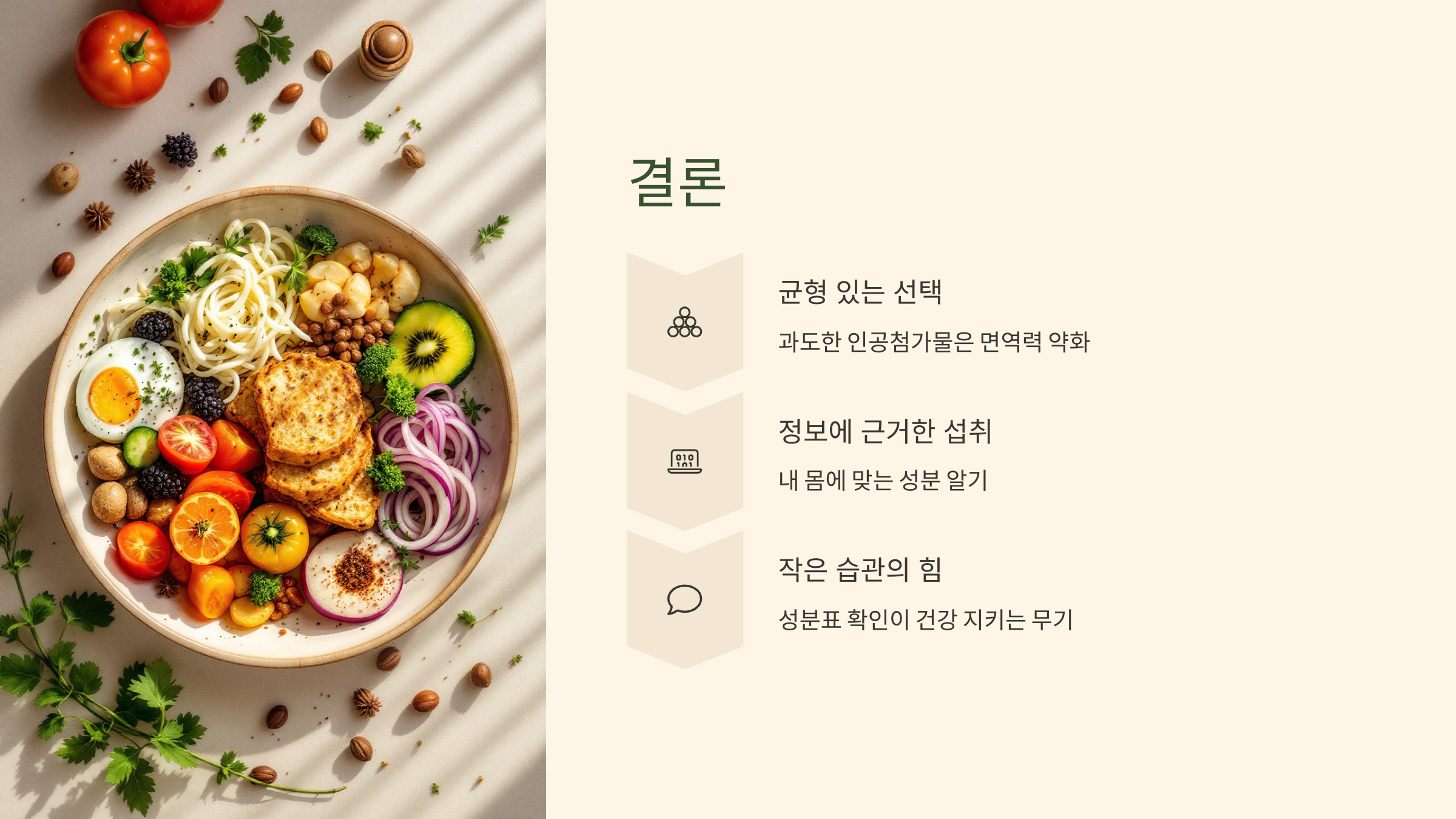 오늘의 한 끼를 준비할 때, 성분표를 한 번 더 살펴보는 작은 습관이 당신의 면역력과 건강을 지키는 강력한 무기가 될 수 있습니다.