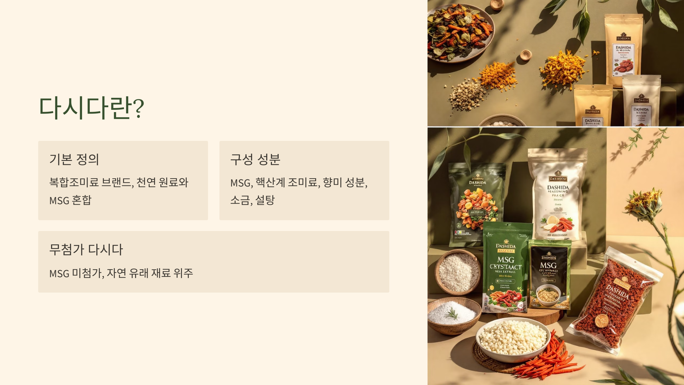 - 다시다는 편리한 조미료지만, 사용량과 성분 확인은 필수입니다.