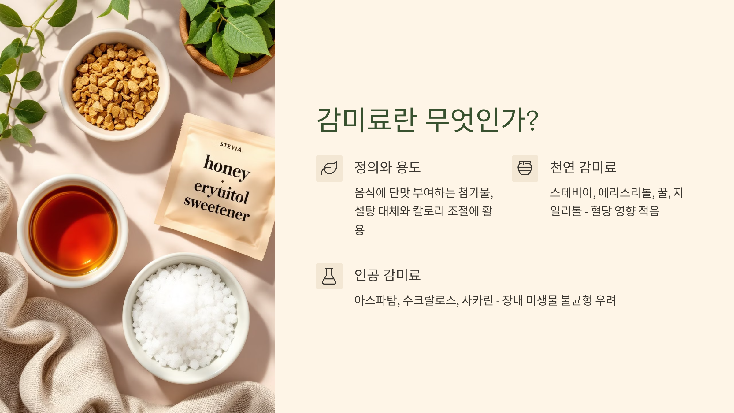 - 정의: 감미료(Sweetener)는 음식이나 음료에 단맛을 부여하는 첨가물로, 천연 유래 성분과 인공 합성 성분으로 나뉨.