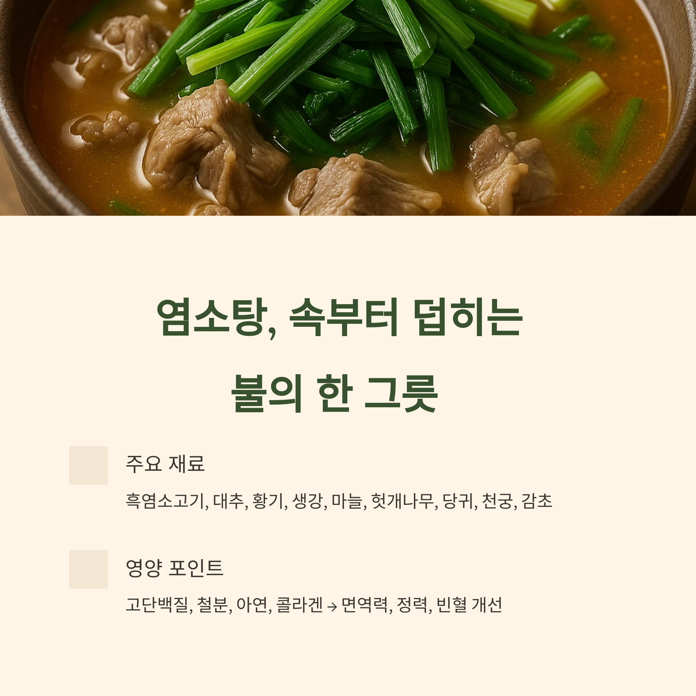 | 소음인 | 손발이 차고 속이 냉한 체질. 염소탕의 따뜻한 성질이 위장을 데우고 기력을 복원 | 황기 + 당귀 + 대추 + 생강 | 탕 속에 찹쌀죽 곁들이면 흡수력 ↑ |