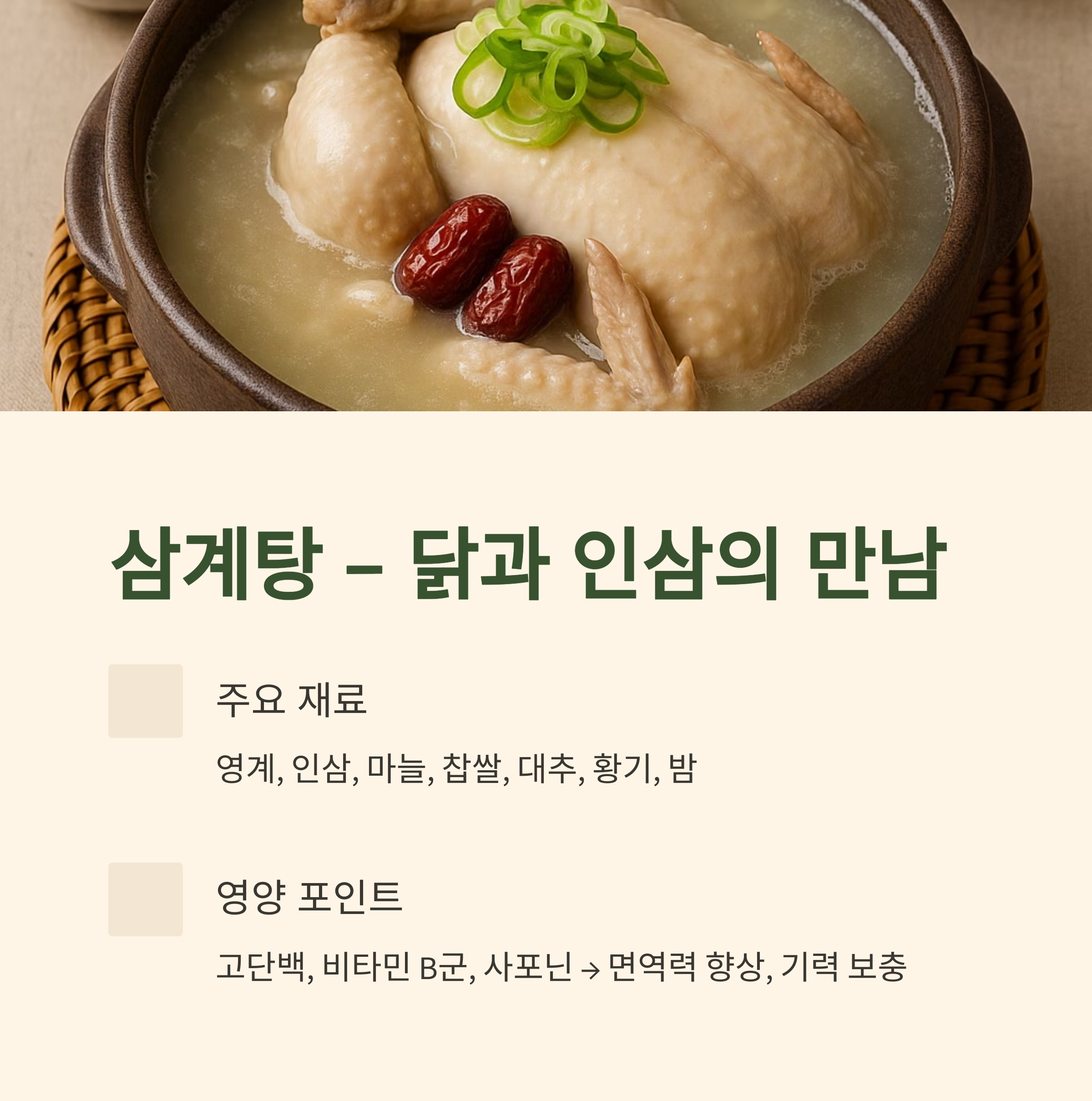 - 삼계탕은 더위 속 기력 저하를 막는 대표 한방 보양식입니다.