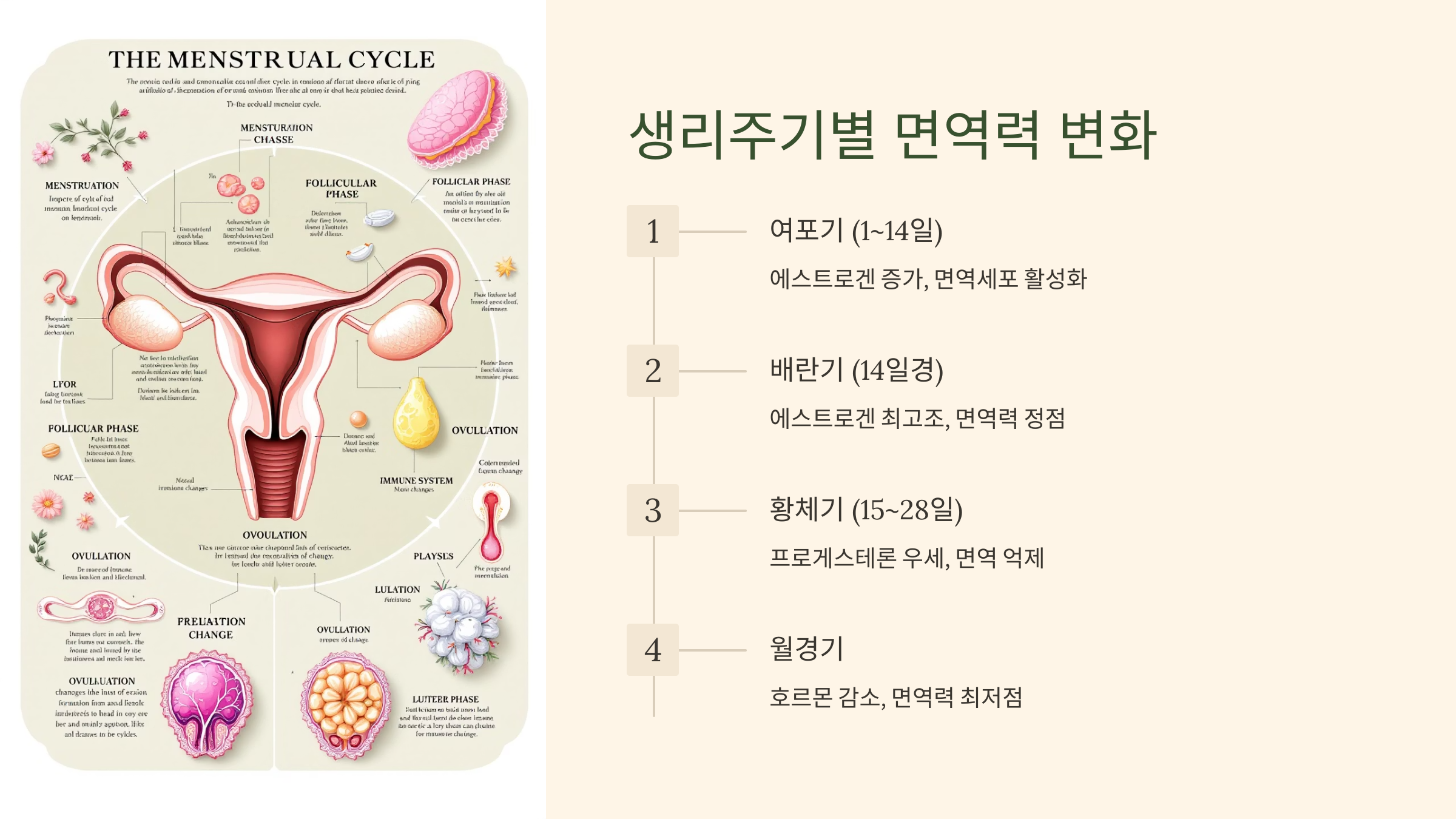 여성의 생리주기는 약 28일을 기준으로 네 시기로 나뉘며, 이 시기마다 여성호르몬의 변화에 따라 면역 기능도 달라집니다.