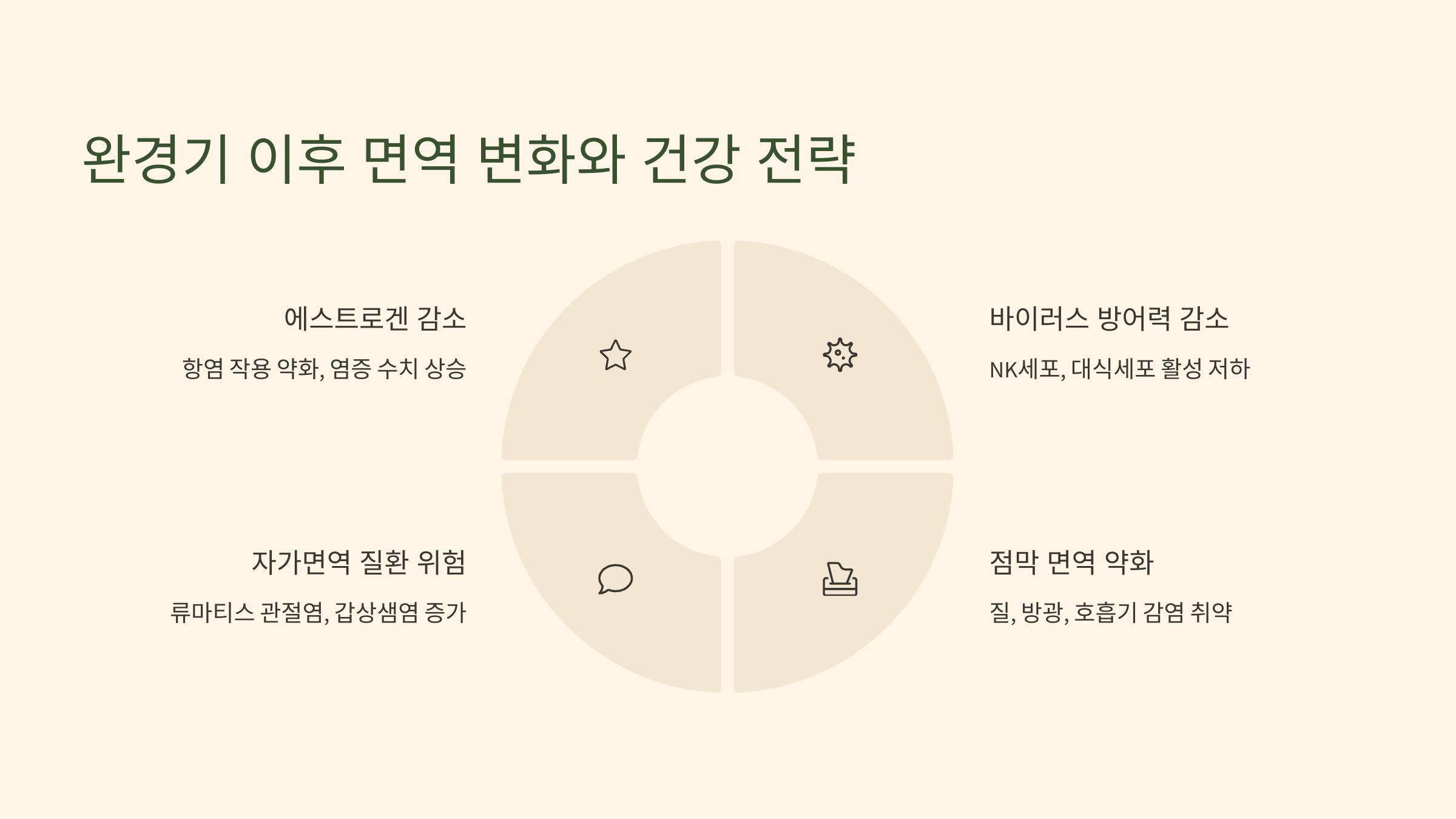 완경은 단순한 월경의 종료가 아니라, 여성 호르몬(에스트로겐, 프로게스테론)의 급격한 감소를 동반하는 생리적 전환점입니다. 이 변화는 면역계에도 직접적인 영향을 미칩니다.