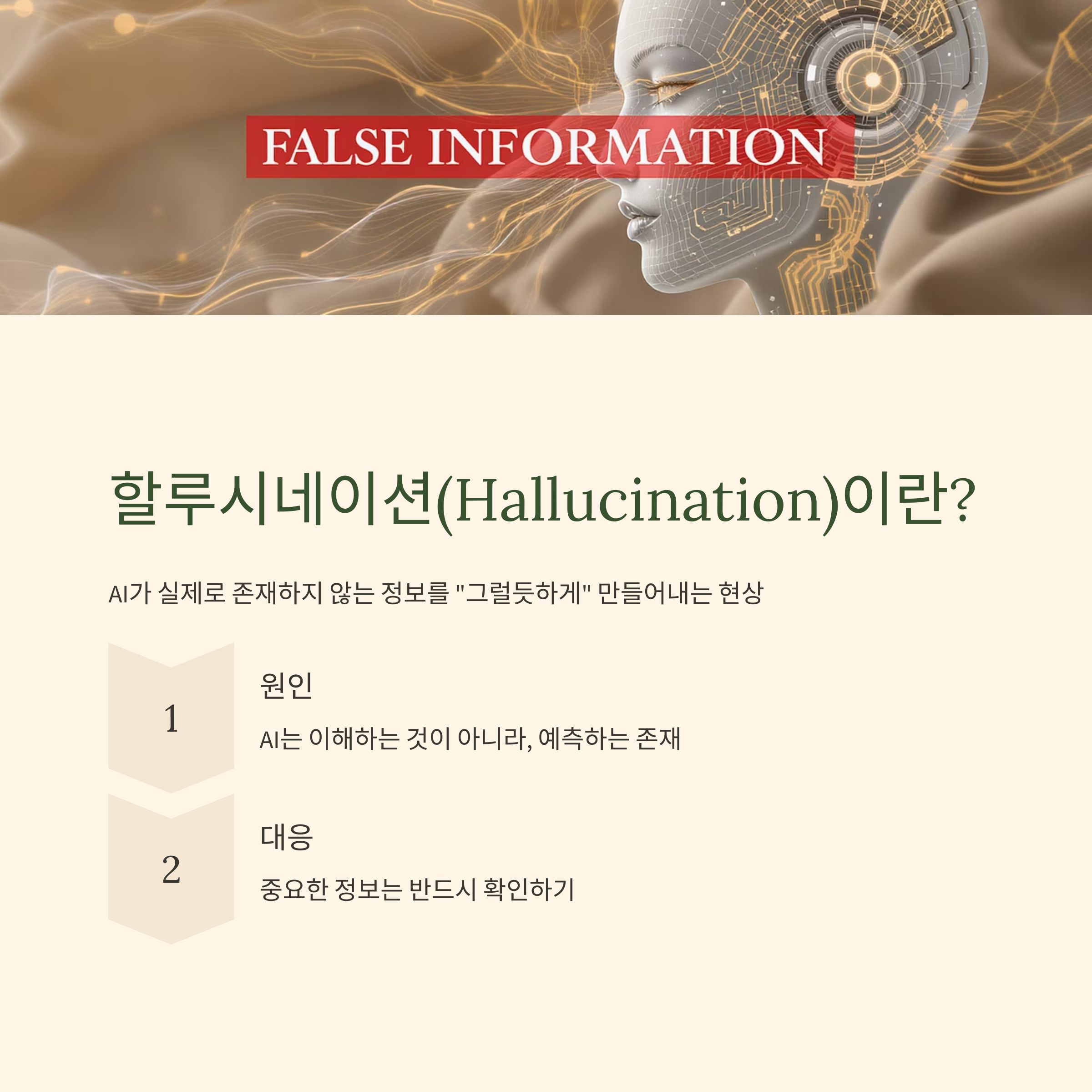 | Hallucination | AI가 실제 없는 정보를 진짜처럼 만들어내는 현상 |