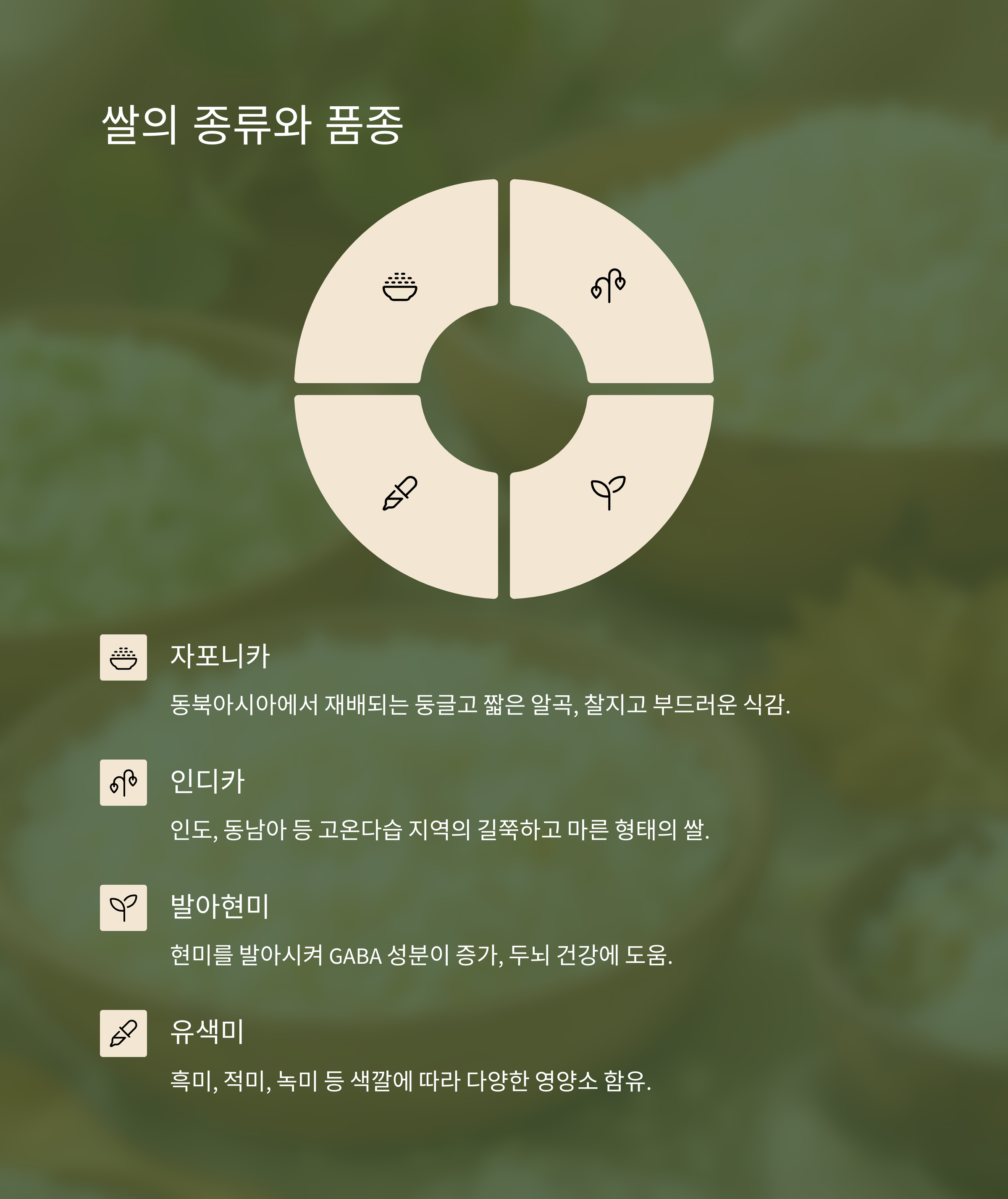 쌀은 단지 ‘하얀 곡물’이 아닙니다. 각각의 품종은 서로 다른 땅에서, 서로 다른 햇살과 바람 속에서 자라났고, 그에 따라 향기, 질감, 색깔, 영양소 모두 달라집니다. 우리는 이 수천 년간의 유전적 여정 속에서 선택된 쌀의 형제들을 마주하고 있습니다. 아래는 대표적인 쌀의 종류와 품종에 대한 심화된 설명입니다.