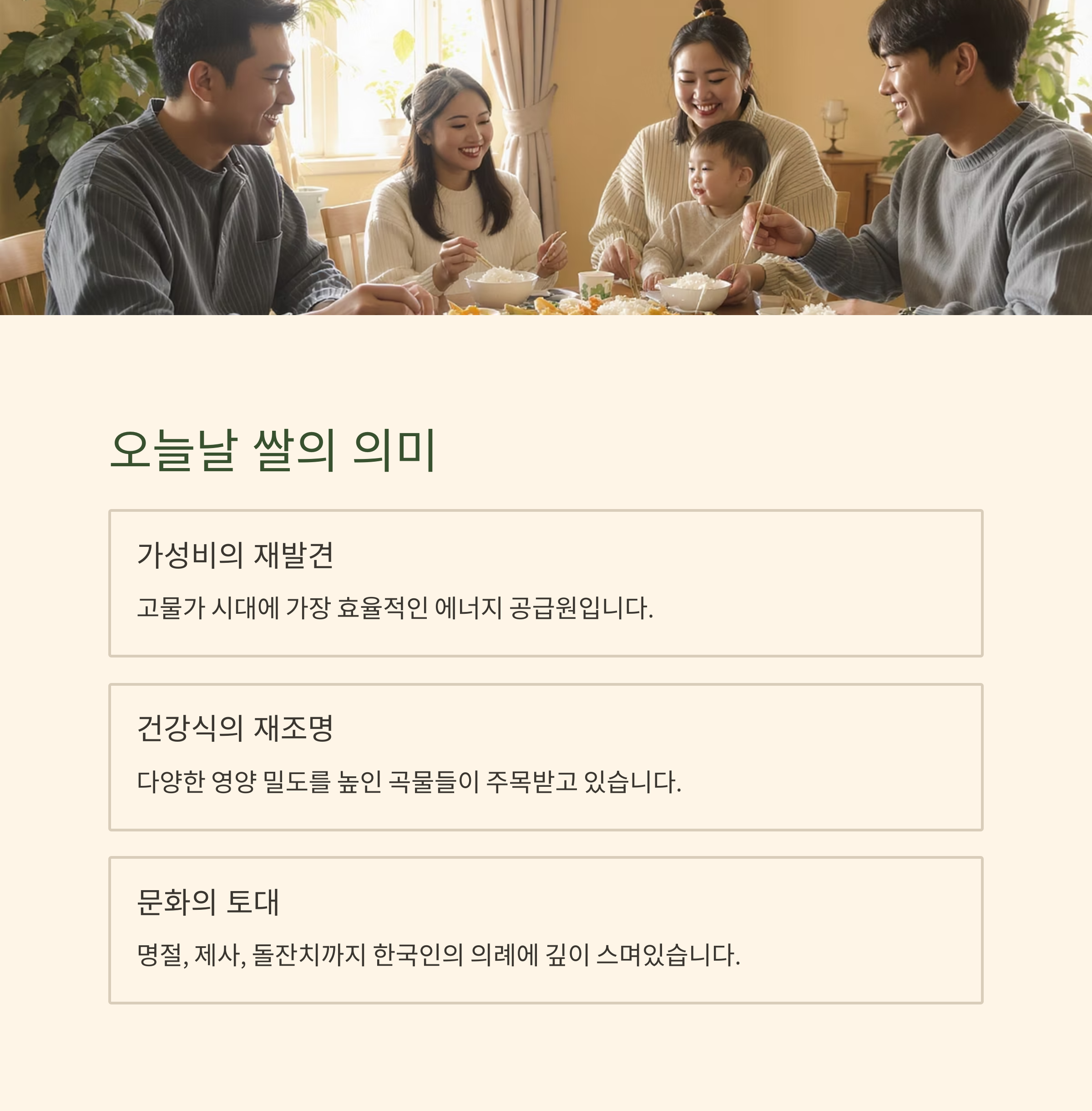 - 문화의 토대: 명절, 제사, 돌잔치, 환갑상까지. 쌀은 여전히 한국인의 의례에 깊이 스며 있다.