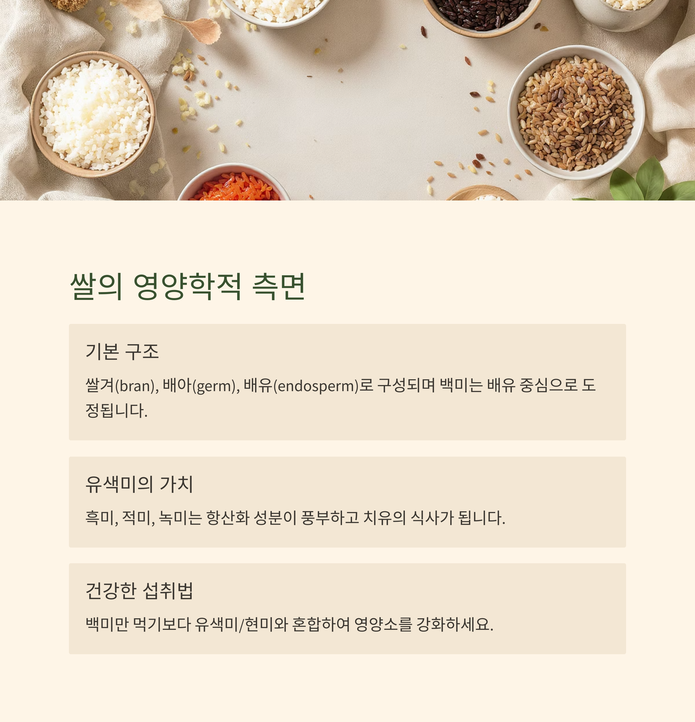 - 백미만 먹기보다는 → 유색미/현미와 혼합하여 섭취