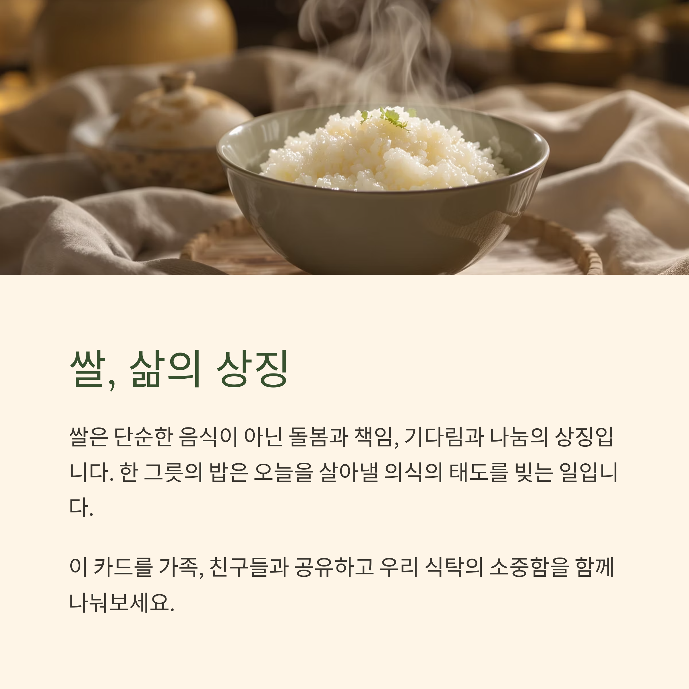 - 문화의 토대: 명절, 제사, 돌잔치, 환갑상까지. 쌀은 여전히 한국인의 의례에 깊이 스며 있다.