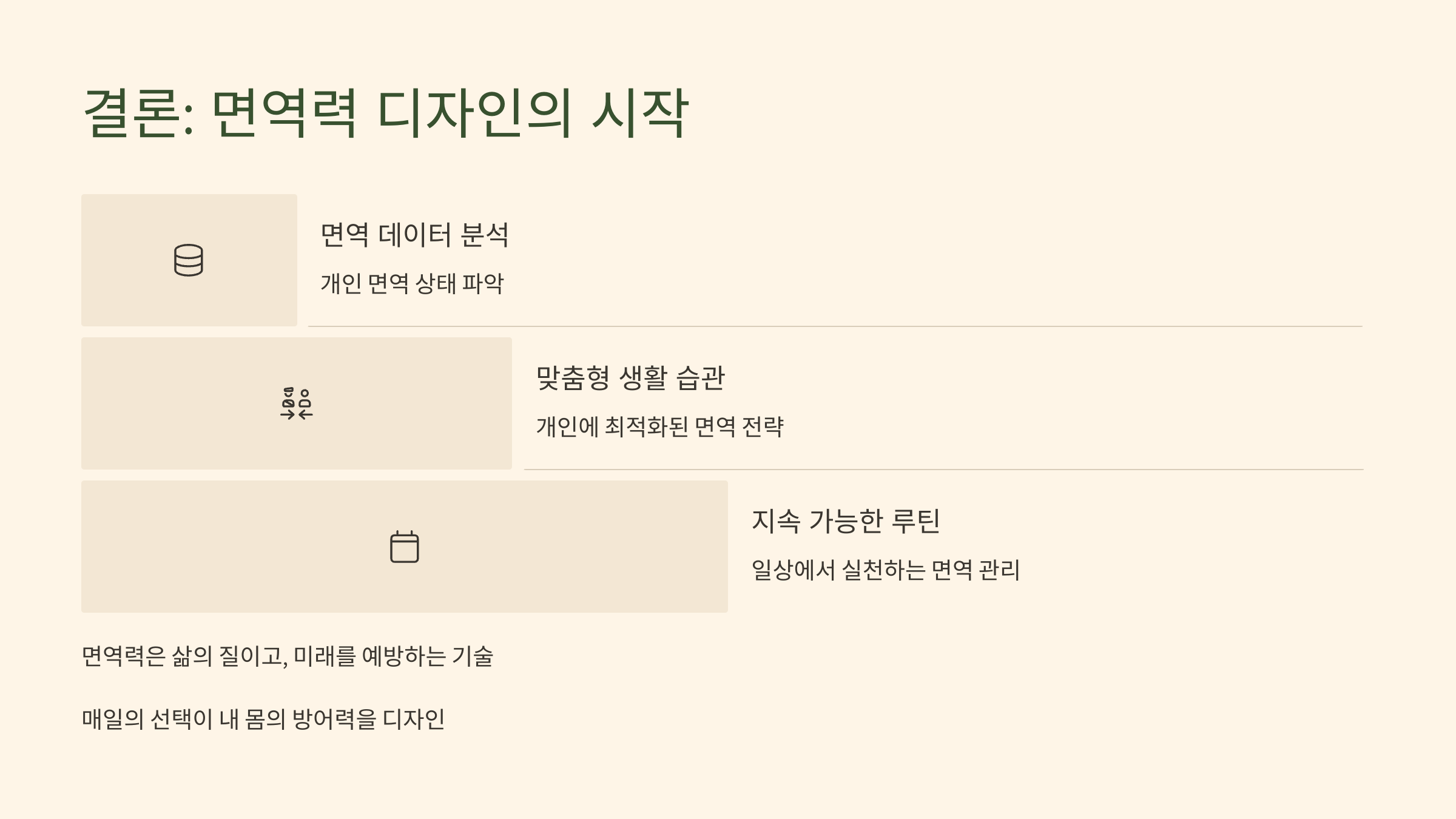 이제 우리는 면역 데이터를 분석하고, 개인에 맞춘 생활 습관을 적용하며, 지속 가능한 루틴으로 실천할 수 있습니다.