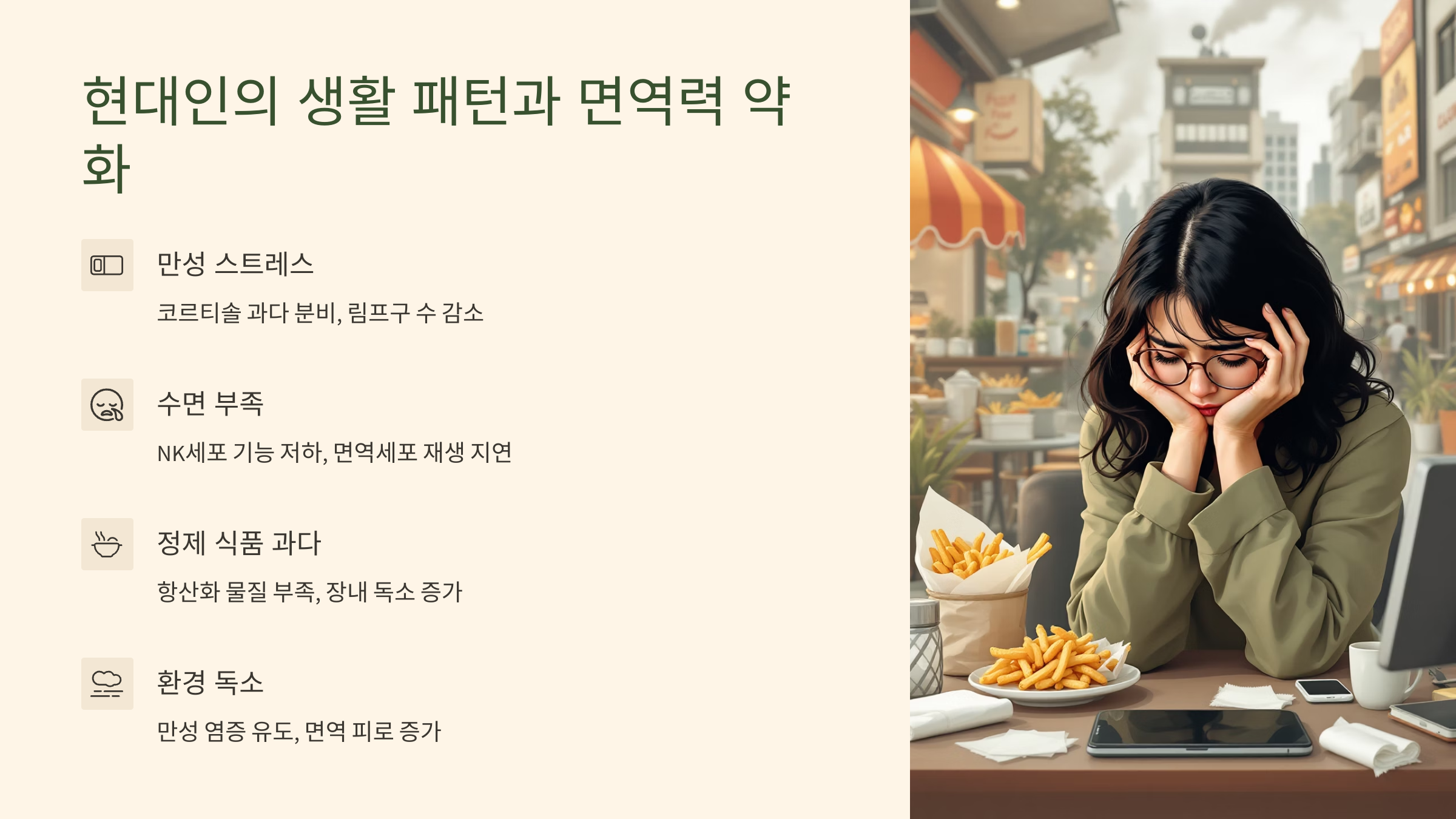 | 환경 독소 (미세먼지, 중금속 등) | 만성 염증 유도, 면역 피로 증가 |