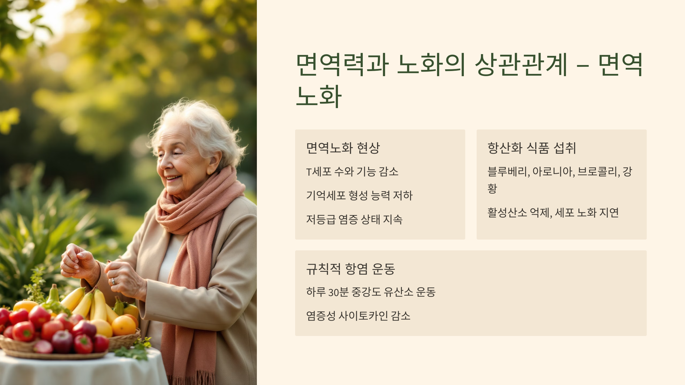 노화에 따라 T세포의 기능 저하, 염증성 물질 증가, 면역 세포 재생 능력 저하 등이 발생하면서 **면역노화(Immune Senescence)**가 진행됩니다.