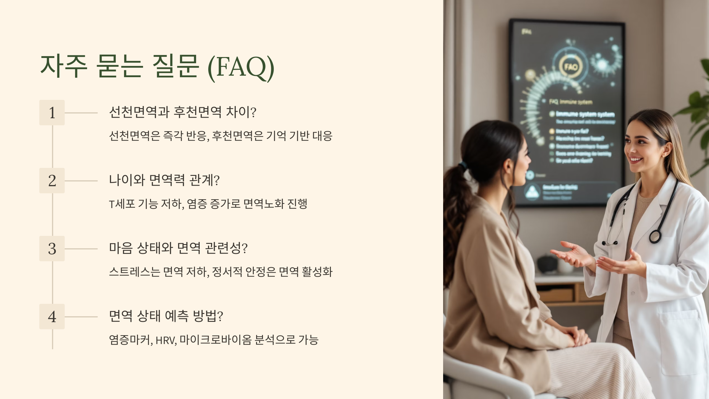 - 염증 마커(CRP, 인터루킨 수치)나 면역 지표(T세포 분포 등)를 통한 정기 건강 스캐닝