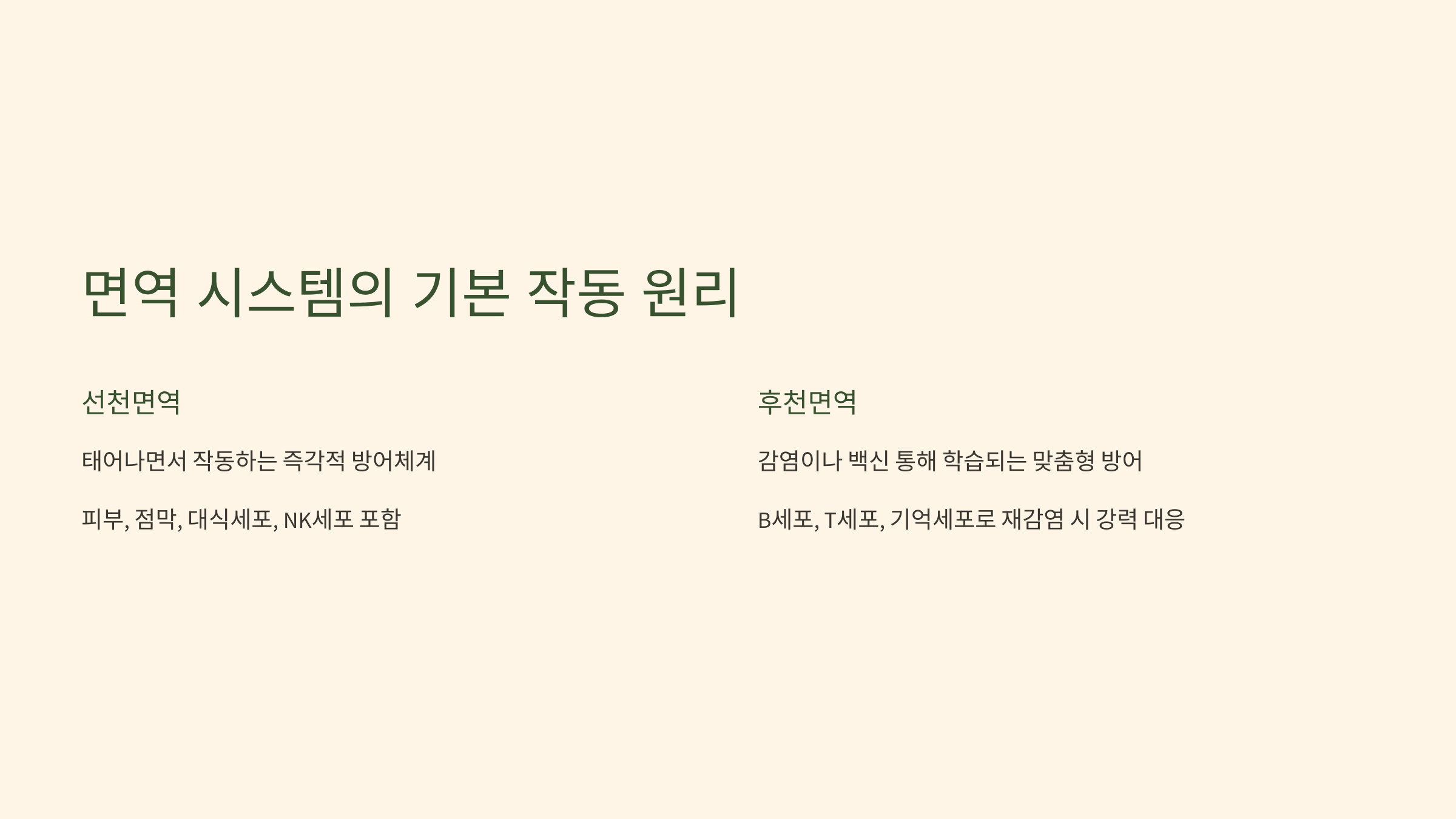 - 인체 면역은 **선천면역(빠르고 비특이적)**과 **후천면역(느리지만 정밀하고 기억 기반)**으로 나뉨.