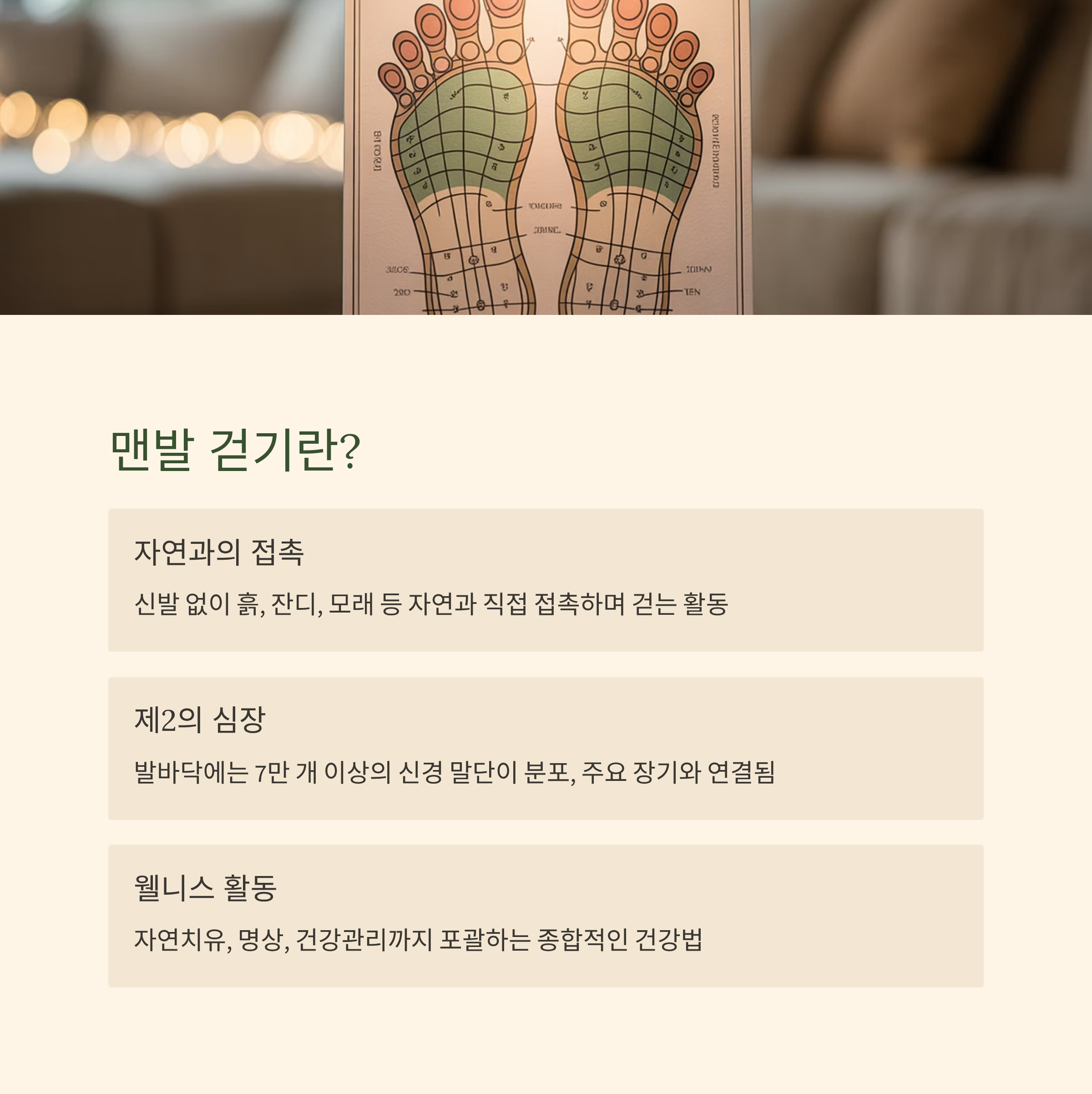(1) 맨발 걷기(Earthing 또는 Grounding)는 신발 없이 흙, 잔디, 모래, 물가 등 자연과 직접 접촉하며 걷는 활동을 말합니다.