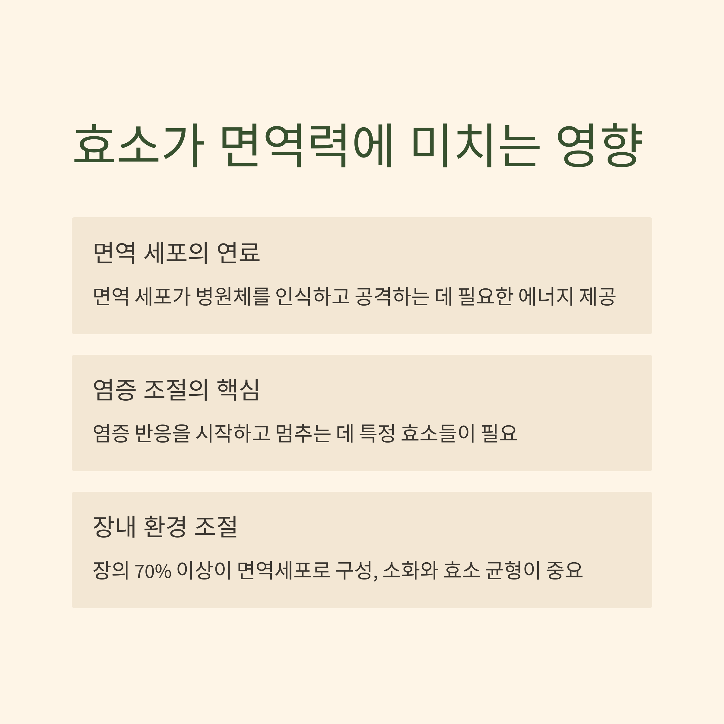- 면역 세포(백혈구, T세포 등)는 체내 효소의 도움 없이는 활동하지 못합니다.