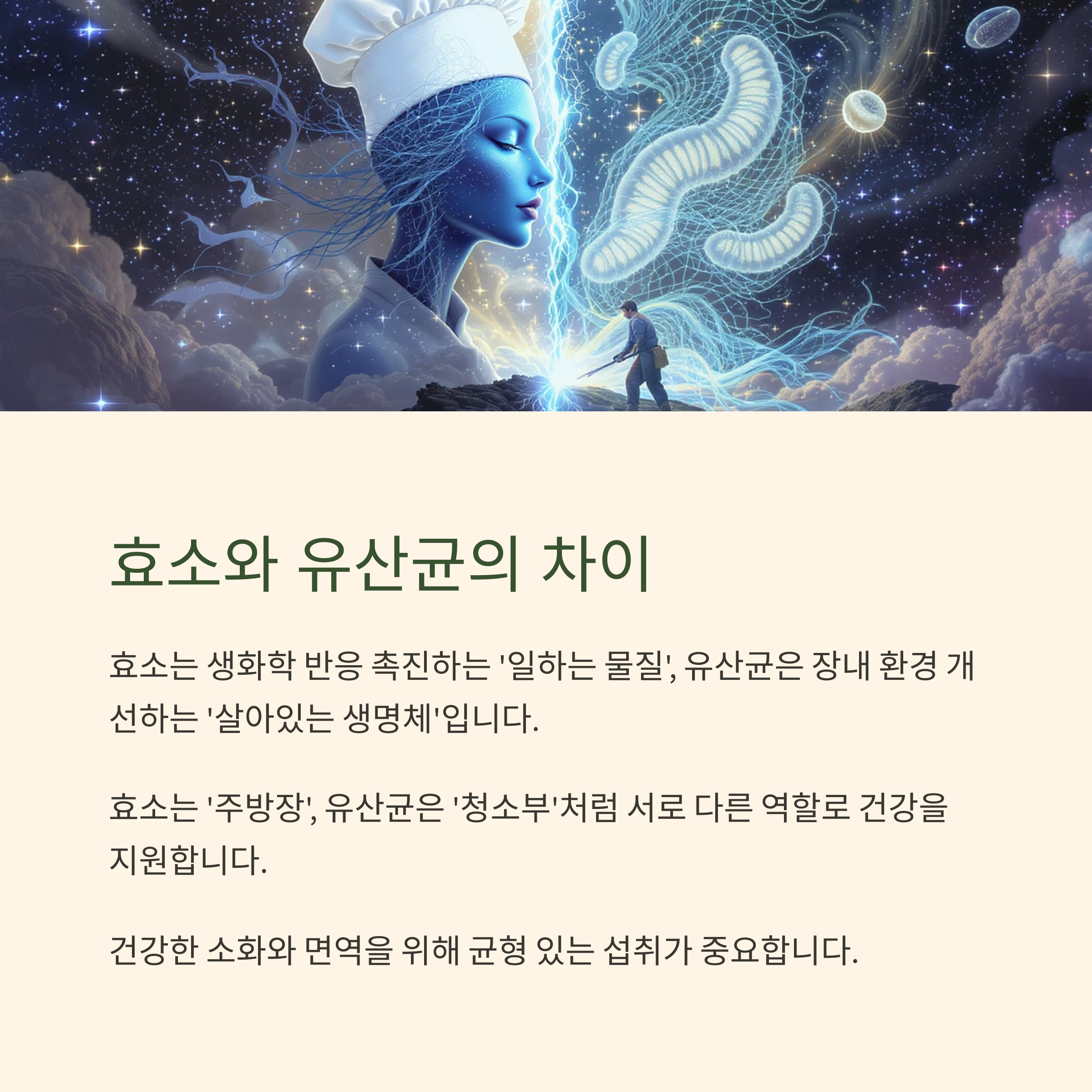 | 보충제 형태 | 단백질 제제, 복합 효소제 | 살아있는 미생물 제제(캡슐, 분말) |