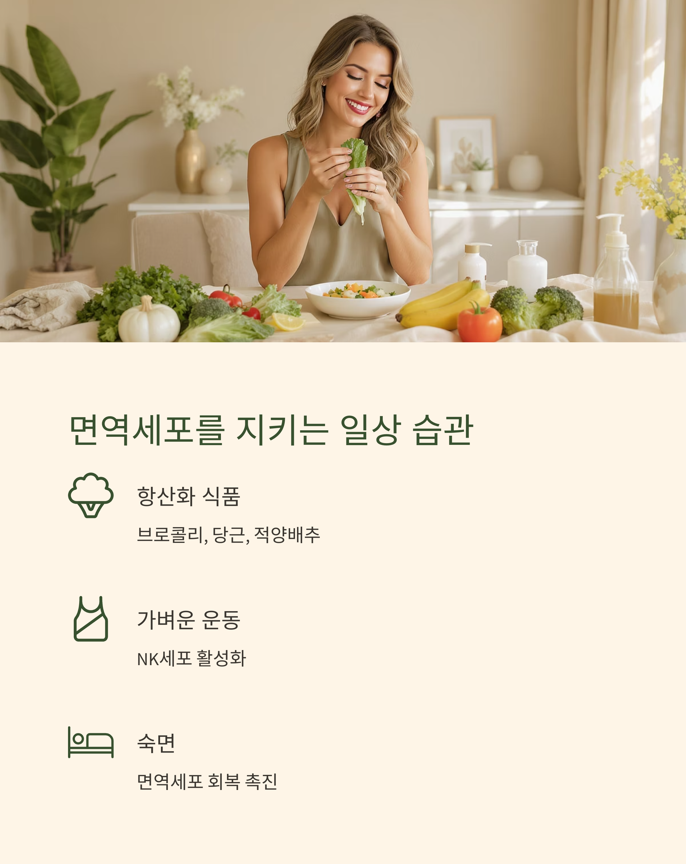 | 🌱 항염 식생활 | 올리브오일, 생강, 강황 등 | 염증 억제 → 면역세포 기능 회복 |