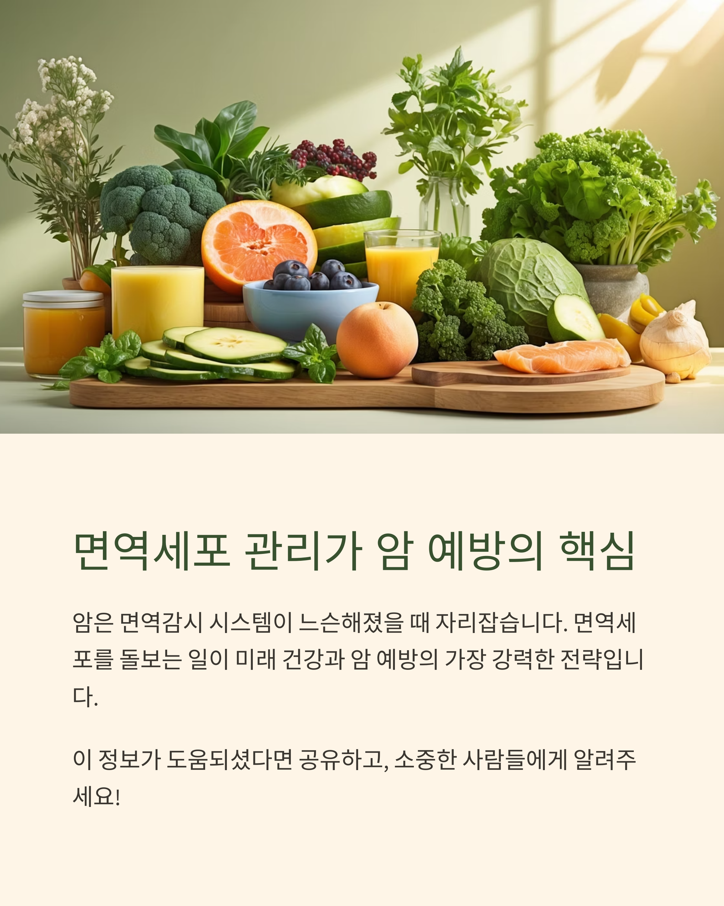 | 🍽️ 항산화 식품 | 브로콜리, 당근, 적양배추 | 암 유발 산화 스트레스 차단, T세포 보호 |
